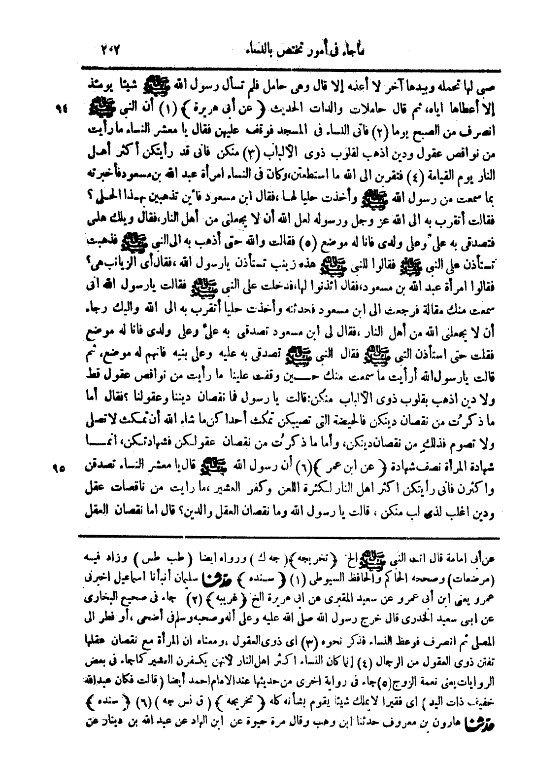 صبي لها تحمله وبيدها آخر لا أعلمه إلا قال وهي حامل فلم تسأل رسول الله صلى الله عليه وسلم شيئا يومئذ إلا أعطاها اياه ثم قال حاملات والدات الحديث (عن أبي هريرة) (1) أن النبي صلى الله عليه وسلم انصرف من الصبح يوما (2) فأتى النساء في المسجد فوقف عليهن فقال يا معشر النساء ما رأيت من نواقص عقول ودين اذهب لقلوب ذوي الالباب (3) منكن فإني قد رأيتكن أكثر أهل النار يوم القيامة (4) فتقربن إلى الله ما استطعتن وكان في النساء امرأة عبد الله بن مسعود فأخبرته بما سمعت من رسول الله صلى الله عليه وسلم وأخذت حليا لها فقال ابن مسعود فأين تذهبين بهذا الحلي؟ فقالت اتقرب به إلى الله عز وجل ورسوله لعل الله أن لا يجعلني من أهل النار فقال ويلك على فتصدقي به علي وعلى ولدي فأنا له موضع (5) فقالت والله حتى اذهب به إلى النبي صلى الله عليه وسلم فذهبت تستأذن على النبي صلى الله عليه وسلم فقالوا للنبي صلى الله عليه وسلم هذه زينب تستأذن يا رسول الله فقال أي الزيانب هي؟ فقالوا امرأة عبد الله بن مسعود فقال ائذنوا لها فدخلت على النبي صلى الله عليه وسلم فقال يا رسول الله إني سمعت منك مقالة فرجعت إلى ابن مسعود فحدثته وأخذت حليا اتقرب به إلى الله واليك رجاء أن لا يجعلني الله من أهل النار فقال لي ابن مسعود تصدقي به علي وعلى ولدي فأنا له موضع فقلت حتى استأذن النبي صلى الله عليه وسلم فقال النبي صلى الله عليه وسلم تصدقي به عليه وعلى بنيه فإنهم له موضع ثم قالت يا رسول الله أرأيت ما سمعت منك حين وقفت علينا ما رأيت من نواقص عقول قط ولا دين اذهب بقلوب ذوي الألباب منكن قالت يا رسول الله فما نقصان ديننا وعقولنا؟ فقال أما ما ذكرت من نقصان دينكن فالحيضة التي تصيبكن تمكث احداكن ما شاء الله ان تمكث لا تصلى ولا تصوم فذلك من نقصان دينكن وأما ما ذكرت من نقصان عقولكن فشهادتكن انما شهادة المرأة نصف شهادة (عن ابن عمر) (6) ان رسول الله صلى الله عليه وسلم قال يا معشر النساء تصدقن واكثرن فإني رأيتكن اكثر اهل النار لكثرة اللعن وكفر العشير ما رأيت من ناقصات عقل ودين اغلب لذي لب منكن قالت يا رسول الله وما نقصان العقل والدين؟ قال أما نقصان العقل