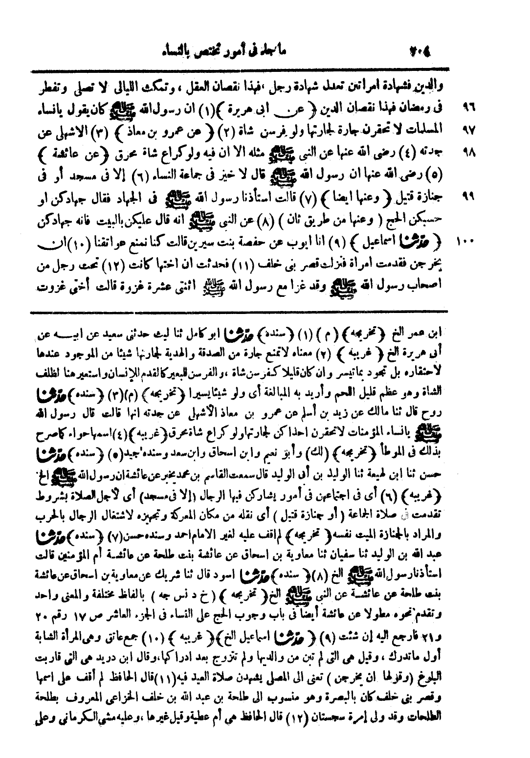 والدين فشهادة امرأتين تعدل شهادة رجل فهذا نقصان العقل وتمكث الليالي لا تصلي وتفطر في رمضان فهذا نقصان الدين (عن أبي هريرة) (1) أن رسول الله صلى الله عليه وسلم كان يقول يا نساء المسلمات لا تحقرن جارة لجارتها ولو فرسن شاة (2) (عن عمرو بن معاذ) (3) الاشهلي عن جدته (4) رضي الله عنها عن النبي صلى الله عليه وسلم مثله إلا أن فيه ولو كراع شاة محرق (عن عائشة) (5) رضي الله عنها ان رسول الله صلى الله عليه وسلم قال لا خير في جماعة النساء (6) إلا في مسجد أو في جنازة قتيل (وعنها أيضا) (7) قالت استأذنا رسول الله صلى الله عليه وسلم في الجهاد فقال جهادكن أو حسبكن الحج (وعنها من طريق ثان) (8) عن النبي صلى الله عليه وسلم انه قال عليكن بالبيت فإنه جهادكن (حدثنا اسماعيل) (9) انا ايوب عن حفصة بنت سيرين قالت كنا نمنع عواتقنا (10) ان يخرجن فقدمت امرأة فنزلت قصر بني خلف (11) فحدثت أن اختها كانت (12) تحت رجل من أصحاب رسول الله صلى الله عليه وسلم وقد غزا مع رسول الله صلى الله عليه وسلم اثنتي عشرة غزوة قالت أختي غزوت