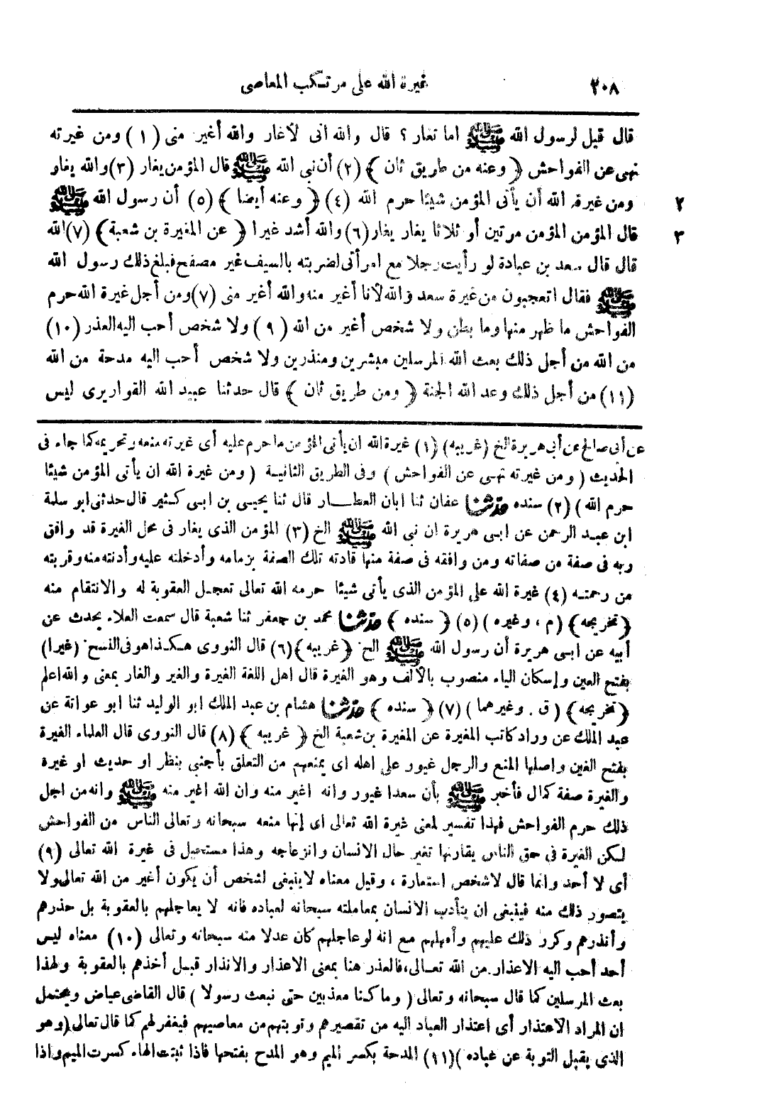 قال قيل لرسول الله صلى الله عليه وسلم اما تغار؟ قال والله أني لأغار والله أغير منى (1) ومن غيرته نهى عن الفواحش (وعنه من طريق ثان) (2) ان نبي الله صلى الله عليه وسلم قال المؤمن يغار (3) والله يغار ومن غيرة الله أن يأتي المؤمن شيئا حرم الله (4) (وعنه أيضا) (5) أن رسول الله صلى الله عليه وسلم قال المؤمن المؤمن مرتين أو ثلاثا يغار يغار (6) والله أشد غيرا (عن المغيرة بن شعبة) (7) الله قال قال سعد بن عبادة لو رأيت رجلا مع امراتي لضربته بالسيف غير مصفح فبلغ ذلك رسول الله صلى الله عليه وسلم قال اتعجبون من غيرة سعد واله لأنا أغير منه والله أغير مني (7) ومن أجل غيرة الله حرم الفواحش ما ظهر منها وما بطن ولا شخص أغير من الله (9) ولا شخص أحب اليه العذر (10) من الله من أجل ذلك بعث الله المرسلين مبشرين ومنذرين ولا شخص أحب إليه مدحة من الله (11) من أجل ذلك وعد الله الجنة (ومن طريق ثان) قال حدثنا عبيد الله القواريري ليس