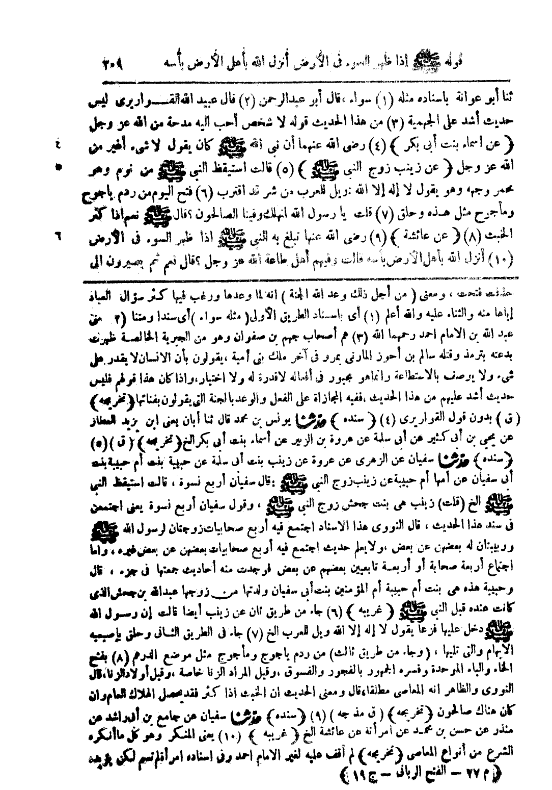 حذفت فتحت ومعنى (من أجل ذلك وعد الله الجنة) انه لما وعدها ورغب فيها كثر سؤال العباد اياها منه والثناء عليه والله أعلم (1) اي بإسناد الطريق الأولى (مثله سواء) اي سندا ومتنا (2) أي عبد الله بن الامام احمد رحمهما الله (3) هم أصحاب جهم بن صفوان وهو من الجبرية الخالصة ظهرت بدعته بترمذ وقتله سالم بن أحوز المارني بمرو في آخر ملك بني أمية يقولون بأن الانسان لا يقدر على شيء ولا يوصف بالاستطاعة وانما هو مجبور في أفعاله لا قدرة له ولا اختيار وإذا كان هذا قولهم فليس حديث أشد عليهم من هذا الحديث ففيه المجازاة على الفعل والوعد بالجنة التي يقولون بفنائها (تخريجه) (ق) بدون قول القواريري (4) (سنده) حدثنا يونس بن محمد قال ثنا أبان يعني ابن يزيد العطار عن يحيى بن أبي كثير عن أبي سلمة عن عروة بن الزبير عن أسماء بنت أبي بكر الخ (تخريجه) (ق) (5) (سنده) حدثنا سفيان عن الزهري عن عروة عن زينب بنت أبي سلمة عن حبيبة بنت أم حبيبة بنت أبي سفيان عن أمها أم حبيبة عن زينب زوج النبي صلى الله عليه وسلم قال سفيان أربع نسوة قالت استيقظ النبي صلى الله عليه وسلم الخ (قلت) زينب هي بنت جحش زوج النبي صلى الله عليه وسلم وقول سفيان أربع نسوة يعني اجتمعن في سند هذا الحديث قال النووي هذا الاسناد اجتمع فيه اربع صحابيات زوجتان لرسول الله صلى الله عليه وسلم وربيبتان له بعضهن عن بعض ولا يعلم حديث اجتمع فيه أربع صحابيات بعضهن عن بعض غيره واما اجتماع اربعة صحابيات أو اربعة تابعيين بعضهم عن بعض فوجدت منه أحاديث جمعتها في جزء قال وحبيبة هذه هي بنت أم حبيبة أم المؤمنين بنت أبي سفيان ولدتها من زوجها عبد الله بن جحش الذي كانت عنده قبل النبي صلى الله عليه وسلم (غريبة) (6) جاء من طريق ثان عن زينب أيضا قالت إن رسول الله صلى الله عليه وسلم دخل عليها فزعا يقول لا إله إلا الله ويل للعرب الخ (7) جاء في الطريق الثاني وحلق بإصبعيه الابهام والتي تليها (وجاء في طريق ثالث) من ردم يأجوج ومأجوج مثل موضع الدرهم (8) بفتح الخاء والباء الموحدة وفسره الجمهور بالفجور والفسوق وقيل المراد الزنا خاصة وقيل أولاد الزنا قال النووي والظاهر أنه المعاصي مطلقا قال ومعنى الحديث أن الخبث إذا كثر فقد يحصل الهلاك التام وان كان هناك صالحون (تخريجه) (ق مذ جه) (9) (سنده) حدثنا سفيان عن جامع بن أبي راشد عن منذر عن حسن بن محمد عن امرأته عن عائشة الخ (غريبة) (10) يعني المنكر وهو كل ما انكره الشرع من أنواع المعاصي (تخريجه) لم أقف عليه لغير الامام احمد وفي اسناده امرأة لم تسم لكن يؤيده