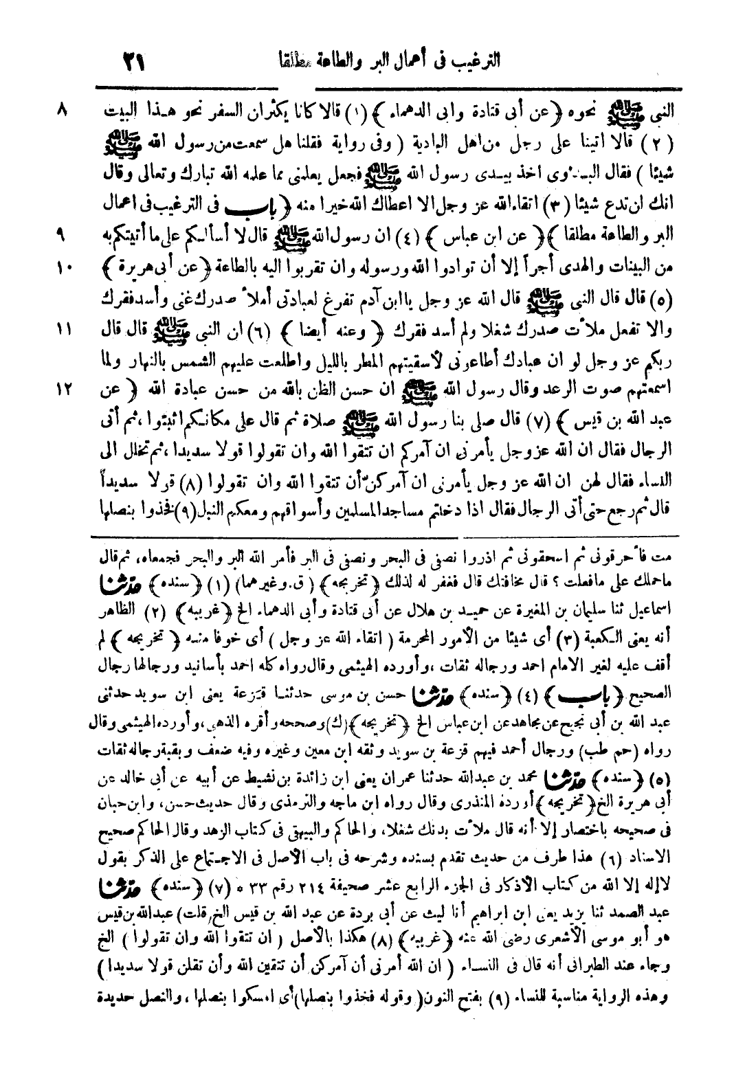 النبي صلى الله عليه وسلم نحوه (عن أبي قتادة وأبي الدهماء) (1) قالا كانا يكثران السفر نحو هذا البيت (2) قالا اتينا على رجل من أهل البادية (وفي رواية فقلنا هل سمعت من رسول الله صلى الله عليه وسلم شيئا) فقال البدوي أخذ بيدي رسول الله صلى الله عليه وسلم فجعل يعلمني مما علمه الله تبارك وتعالى وقال أنك لن تدع شيئا (3) اتقاء الله عز وجل إلا اعطاك الله خيرا منه (باب في الترغيب في أعمال البر والطاعة مطلقا) (عن ابن عباس) (4) أن رسول الله صلى الله عليه وسلم قال لا أسألكم على ما اتيتكم به من البينات والهدى أجرا إلا أن توادوا الله ورسوله وأن تقربوا إليه بالطاعة (عن أبي هريرة) (5) قال قال النبي صلى الله عليه وسلم قال الله عز وجل يا ابن آدم تفرغ لعبادتي أملأ صدرك غنى وأسد فقرك والا تفعل ملأت صدرك شغلا ولم أسد فقرك (وعنه أيضا) (6) أن النبي صلى الله عليه وسلم قال قال ربكم عز وجل لو أن عبادك أطاعوني لأسقيتهم المطر بالليل وأطلعت عليهم الشمس بالنهار ولما اسمعتهم صوت الرعد وقال رسول الله صلى الله عليه وسلم أن حسن الظن بالله من حسن عبادة الله (عن عبد الله بن قيس) (7) قال صلى بنا رسول الله صلى الله عليه وسلم صلاة ثم قال على مكانكم اثبتوا ثم اتى الرجال فقال أن الله عز وجل يأمرني أن آمركم أن تتقوا الله وأن تقولوا قولا سديدا ثم تخلل إلى النساء فقال لهن أن الله عز وجل يأمرني أن آمركن أن تتقوا الله وأن تقولوا (8) قولا سديدا قال ثم رجع حتى اتى الرجال فقال إذا دخلتم مساجد المسلمين وأسواقهم ومعكم النبل (9) فخذوا بنصلها