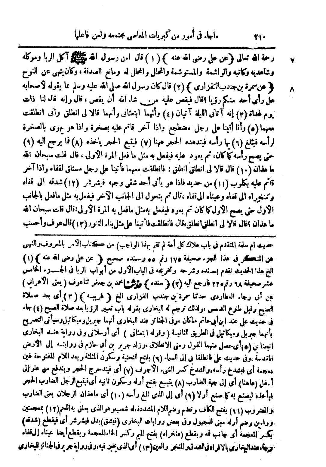 رحمة الله تعالى (عن علي رضي الله عنه) (1) قال لعن رسول الله صلى الله عليه وسلم آكل الربا وموكله وشاهديه وكاتبه والواشمة والمستوشمة والمحلل والمحلل له ومانع الصدقة وكان ينهى عن النوح (عن سمرة بن جندب الفزاري) (2) قال كان رسول الله صلى الله عليه وسلم مما يقوله لأصحابه هل رأى أحد منكم رؤيا؟ قال فيقص عليه من شاء الله أن يقص قال وإنه قال لنا ذات يوم غداة (3) إنه آتاني الليلة آيتان (4) وانهما ابتعثاني وانهما قالا لي انطلق واني انطلقت معهما (5) وانا اتينا على رجل مضطجع واذا آخر قائم عليه بصخرة واذا هو يهوي بالصخرة لرأسه فيثلغ (6) بها رأسه فيتدهده الحجر ههنا (7) فيتبع الحجر يأخذه (8) فما يرجع إليه (9) حتى يصح رأسه كما كان ثم يعود عليه فيفعل به مثل ما فعل المرة الأولى قال قلت سبحان الله ما هذان (10) قال قالا لي انطلق انطلق فانطلقت معهما فأتينا على رجل مستلق لقفاه وإذا آخر قائم عليه بكلوب (11) من حديد فإذا هو يأتي أحد شقي وجهه فيشرشر (12) شدقه إلى قفاه ومنخراه إلى قفاه وعيناه إلى قفاه قال ثم يتحول إلى الجانب الآخر فيفعل به مثل ما فعل بالجانب الأول حتى يصبح الأول كما كان ثم يعود فيفعل به مثل ما فعل به المرة الأولى قال قلت سبحان الله ما هذان؟ قال قالا لي انطلق انطلق قال فانطلقت فأتينا على مثل بناء التنور (13) قال عوف وأحسب