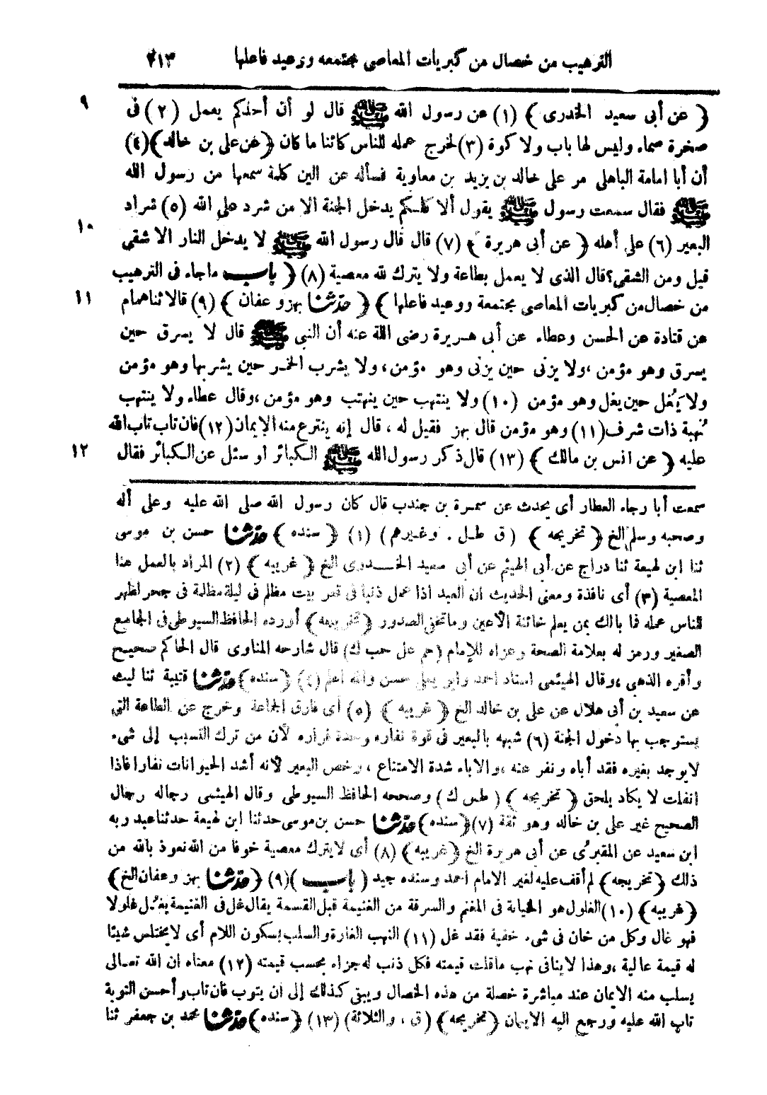 (عن أبي سعيد الخدري) (1) عن رسول الله صلى الله عليه وسلم قال لو أن أحدكم يعمل (2) في صخرة سماء وليس لها باب ولا كوة (3) لخرج عمله للناس كائنا ما كان (عن علي بن خالد) (4) أن أبا امامة الباهلي مر على خالد بن يزيد بن معاوية فسأله عن الين كلمة سمعها من رسول الله صلى الله عليه وسلم فقال سمعت رسول الله صلى الله عليه وسلم يقول ألا كلكم دخل الجنة الا من شرد على الله (5) شراد البعير (6) على أهله (عن أبي هريرة) (7) قال قال رسول الله صلى الله عليه وسلم لا يدخل النار الا شقي قيل ومن الشقي؟ قال الذي لا يعمل بطاعة ولا يترك لله معصية (8) (باب ما جاء في الترهيب من خصال من كبريات المعاصي مجتمعة ووعيد فاعلها) (حدثنا بهز وعفان) (9) قالا ثنا همام عن قتادة عن الحسن وعطاء عن أبي هريرة رضي الله عنه ان النبي صلى الله عليه وسلم قال لا يسرق حين يسرق وهو مؤمن ولا يزنى حين يزني وهو مؤمن ولا يشرب الخمر حين يشربها وهو مؤمن ولا يغل حين يغل وهو مؤمن (10) ولا ينتهب حين ينتهب وهو مؤمن وقال عطاء ولا ينتهب نهبة ذات شرف (11) وهو مؤمن قال بهز فقيل له قال إنه ينتزع منه الايمان (12) فإن تاب تاب الله عليه (عن أنس بن مالك) (13) قال ذكر رسول الله صلى الله عليه وسلم الكبائر أو سئل عن الكبائر فقال