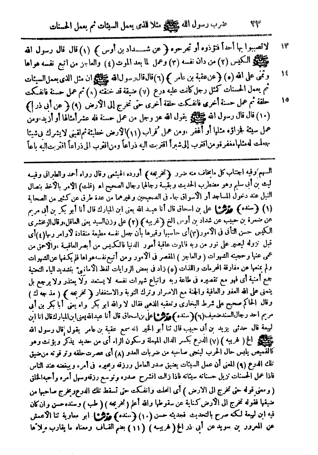 لا تصيبوا بها أحدا فتؤذوه أو تجرحوه (عن شداد بن أوس) (1) قال قال رسول الله صلى الله عليه وسلم الكيس (2) من دان نفسه (3) وعمل لما بعد الموت (4) والعاجز من اتبع نفسه هواها وتمنى على الله (5) (عن عقبة بن عامر) (6) قال قال رسول الله صلى الله عليه وسلم أن مثل الذي يعمل السيئات ثم يعمل الحسنات كمثل رجل كانت عليه درع (7) ضيقة قد خنقته (8) ثم عمل حسنة فانفكت حلقة ثم عمل حسنة أخرى فانفكت حلقة أخرى حتى تخرج إلى الأرض (9) (عن أبي ذر) (10) قال قال رسول الله صلى الله عليه وسلم يقول الله عز وجل من عمل حسنة فله عشر أمثاله أو أزيد ومن عمل سيئة فجزاؤه مثلها أو أغفر ومن عمل قراب (11) الأرض خطيئة ثم لقيني لا يشرك بي شيئا جعلت له مثلها مغفرة ومن اقترب إلي شبرا اقتربت إليه ذراعا ومن اقترب إلى ذراعا اقتربت إليه باعا