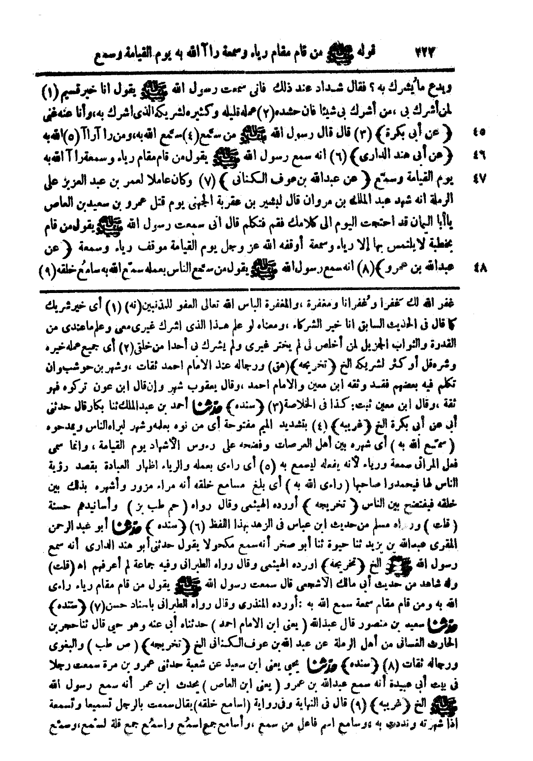 ويدع ما يشرك به؟ فقال شداد عند ذلك فإني سمعت رسول الله صلى الله عليه وسلم يقول أنا خير قسيم (1) لمن اشرك بي من أشرك بي شيئا فان حشده (2) عمله قليله وكثيره لشريكه الذي اشرك به وانا عنه غني (عن أبي بكرة) (3) قال قال رسول الله صلى الله عليه وسلم من سمع (4) سمع الله به ومن راآ راآ (5) الله به (عن أبي هند الداري) (6) أنه سمع رسول الله صلى الله عليه وسلم يقول من قام مقام رياء وسمعة راآ الله به يوم القيامة وسمع (عن عبد الله بن عوف الكناني) (7) وكان عاملا لعمر بن عبد العزيز على الرملة انه شهد عبد الملك بن مروان قال لبشير بن عقربة الجهني يوم قتل عمرو بن سعيد بن العاص يا أبا اليمان قد احتجت اليوم الى كلامك فقم فتكلم قال اني سمعت رسول الله صلى الله عليه وسلم يقول من قام بخطبة لا يلتمس بها إلا رياء وسمعة أوقفه الله عز وجل يوم القيامة موقف رياء وسمعة (عن عبد الله بن عمرو) (8) أنه سمع رسول الله صلى الله عليه وسلم يقول من سمع الناس بعمله سمع الله به سامع خلقه (9)