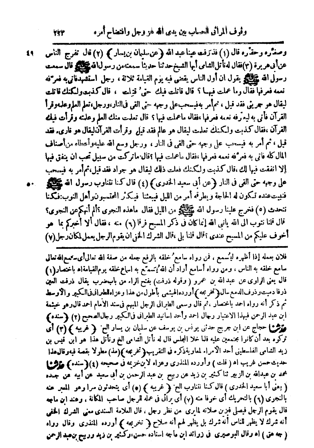 وصغره وحقره قال (1) فذرفت عينا عبد الله (عن سليمان بن يسار) (2) قال تفرج الناس عن أبي هريرة (3) فقال له نأتل الشامي أيها الشيخ حدثنا حديثا سمعته من رسول الله صلى الله عليه وسلم قال سمعت رسول الله صلى الله عليه وسلم يقول ان اول الناس يقضي فيه يوم القيامة ثلاثة رجل استشهد فإني به فعرفه نعمه فعرفها فقال وما عملت فيها؟ قال قاتلت فيك حتى قتلت قال كذبت ولكنك قاتلت ليقال هو جريئي فقد قيل ثم أمر به فيسحب على وجهه حتى القي في النار ورجل تعلم العلم وعلمه وقرأ القرآن فأتى به ليعرفه نعمه فعرفها فقال ما عملت فيها؟ قال تعلمت منك العلم وعلمته وقرأت فيك القرآن فقال كذبت ولكنك تعلمت ليقال هو عالم فقد قيل وقرأت القرآن ليقال هو قارئ فقد قيل ثم أمر به فيسحب على وجهه حتى القي في النار ورجل وسع الله عليه وأعطاه من أصناف المال كله فأتى به فعرفه نعمه فعرفها فقال ما عملت فيها؟ قال ما تركت من سبيل تحب ان ينفق فيها إلا انفقت فيها لك قال كذبت ولكنك فعلت ذلك ليقال هو جواد فقد قيل ثم أمر به فيسجب على وجهه حتى القي في النار (عن ابي سعيد الخدري) (4) قال كنا نتناوب رسول الله صلى الله عليه وسلم فنبيت عنده تكون له الحاجة ويطرقه أمر من الليل فيبعثنا فيكثر المحتسبون وأهل النوب فكنا نتحدث (5) فخرج علينا رسول الله صلى الله عليه وسلم من الليل فقال ما هذه النجوى؟ الم أنهكم عن النجوى؟ قال قلنا نتوب إلى الله يا نبي الله إنما كان في ذكر المسيح فرقا (6) منه فقال ألا أخبركم بما هو أخوف عليكم من المسيح عندي؟ قال قلنا بلى قال الشرك الخفي ان يقوم الرجل يعمل لمكان رجل (7)