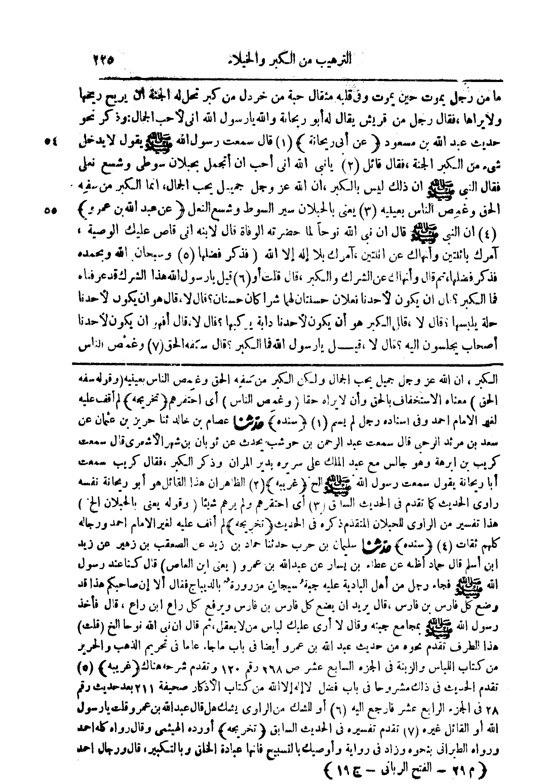 الكبر إن الله عز وجل جميل يحب الجمال ولكن الكبر من سفه الحق وغمص الناس بعينيه (وقوله سفه الحق) معناه الاستخفاف بالحق وان لا يراه حقا (وغمص الناس) أي احتقرهم (تخريجه) لم أقف عليه لغير الامام احمد وفي اسناده رجل لم يسم (1) (سنده) حدثنا عصام بن خالد ثنا حريز بن عثمان عن سعد بن مرثد الرحبي قال سمعت عبد الرحمن بن حوشب يحدث عن ثوبان بن شهر الاشعري قال سمعت كريب بن ابرهة وهو جالس مع عبد الملك على سريره يدير المران وذكر الكبر فقال كريب سمعت ابا ريحانه يقول سمعت رسول الله صلى الله عليه وسلم الخ (غريبة) (2) الظاهر ان هذا القائل هو ابو ريحانه نفسه راوي الحديث كما تقدم قي الحديث الساق (3) أي احتقرهم ولم يرهم شيئا (وقوله يعني بالحبلان الخ) هذا تفسير من الراوي للحبلان المتقدم ذكره في الحديث (تخريجه) لم أقف عليه لغير الامام احمد ورجاله كلهم ثقات (4) (سنده) حدثنا سليمان بن حرب حدثنا حماد بن زيد عن الصعقب بن زهير عن زيد ابن أسلم قال حماد أظنه عن عطاء بن يسار عن عبد الله بن عمرو (يعني ابن العاص) قال كنا عند رسول الله صلى الله عليه وسلم فجاء رجل من أهل البادية عليه جبة سيجان مزرورة بالديباج فقال ألا إن صاحبكم هذا وضع كل فارس بن فارس قال يريد ان يضع كل فراس بن فارس ويرفع كل راع ابن راع قال فأخذ رسول الله صلى الله عليه وسلم بمجامع جبنه وقال لا أرى عليك لباس من لا يعقل ثم قال نبي الله نوحا الخ (قلت) هذا الطرف تقدم نحوه من حديث عبد الله بن عمرو ايضا في باب ما جاء عاما في تحريم الذهب والحرير كتاب اللباس والزينة في الجزء السابع عشر ص 168 رقم 120 وتقدم شرحه هناك (غريبه) (5) تقدم الحديث في ذلك مشروحا في باب فضل لا إله إلا الله من كتاب الاذكار صحيفة 211 بعد حديث رقم 28 في الجزء الرابع عشر فارجع اليه (6) أو للشك من الراوي يشك هل قال عبد الله بن عمرو قلت يا رسول الله أو القائل غيره (7) تقدم تفسيره في الحديث السابق (تخريجه) أورده الهيثمي وقال رواه كله احمد ورواه الطبراني بنحوه وزاد في رواية وأوصيك بالتسبيح فإنها عبادة الخلق وبالتكبير قال ورجال أحمد