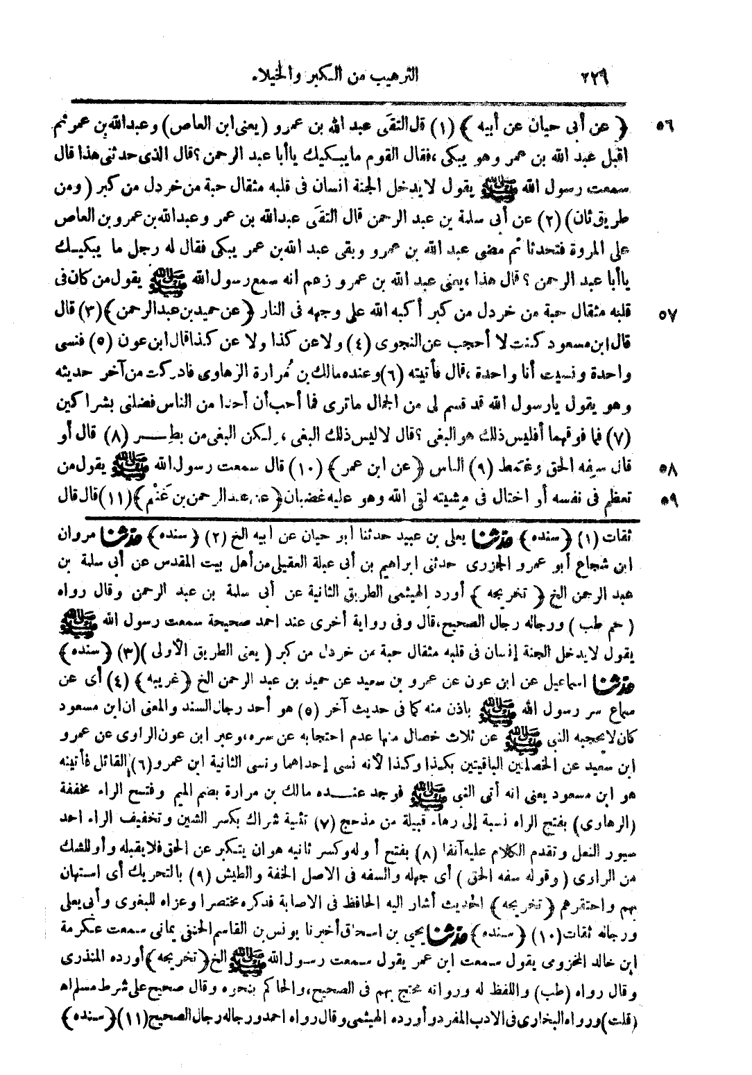 (عن أبي حيان عن أبيه) (1) قال التقي عبد الله بن عمرو (يعني ابن العاص) وعبد الله بن عمر ثم اقبل عبد الله بن عمر وهو يبكي فقال القوم ما يبكيك يا ابا عبد الرحمن؟ قال الذي حدثني هذا قال سمعت رسول الله صلى الله عليه وسلم يقول لا يدخل الجنة انسان في قلبه مثقال حبة من خردل من كبر (ومن طريق ثان) (2) عن أبي سلمة بن عبد الرحمن قال التقى عبد الله بن عمر وعبد الله بن عمرو بن العاص على المروة فتحدثا ثم مضى عبد الله بن عمرو وبقي عبد الله بن عمر يبكي فقال له رجل ما يبكيك يا أبا عبد الرحمن؟ قال هذا يعني عبد الله بن عمرو زعم انه سمع رسول الله صلى الله عليه وسلم يقول من كان في قلبه مثقال حبة من خردل من كبر أكبه الله على وجهه في النار (عن حميد بن عبد الرحمن) (3) قال قال ابن مسعود كنت لا أحجب عن النجوى (4) ولا عن كذا ولا عن كذا قال ابن عون (5) فنسى واحدة ونسيت أنا واحدة قال فأتيته (6) وعنده مالك بن مراوة الرهاوى فأدركت من آخر حديثه وهو يقول يارسول الله قد قسم لي من الجمال ما ترى فما أحب أن أحدا من الناس فضلني بشراكين (7) فما فوقهما أفليس ذلك هو البغى؟ قال لا ليس ذلك البغى لكن البغى من بطر (8) قال أو قال سفه الحق وغمط (9) الناس (عن ابن عمر) (10) قال سمعت رسول الله صلى الله عليه وسلم يقول من تعظم في نفسه أو اختال في مشيته لقى الله وهو عليه غضبان (عن عبد الرحمن بن غنم) (11) قال قال