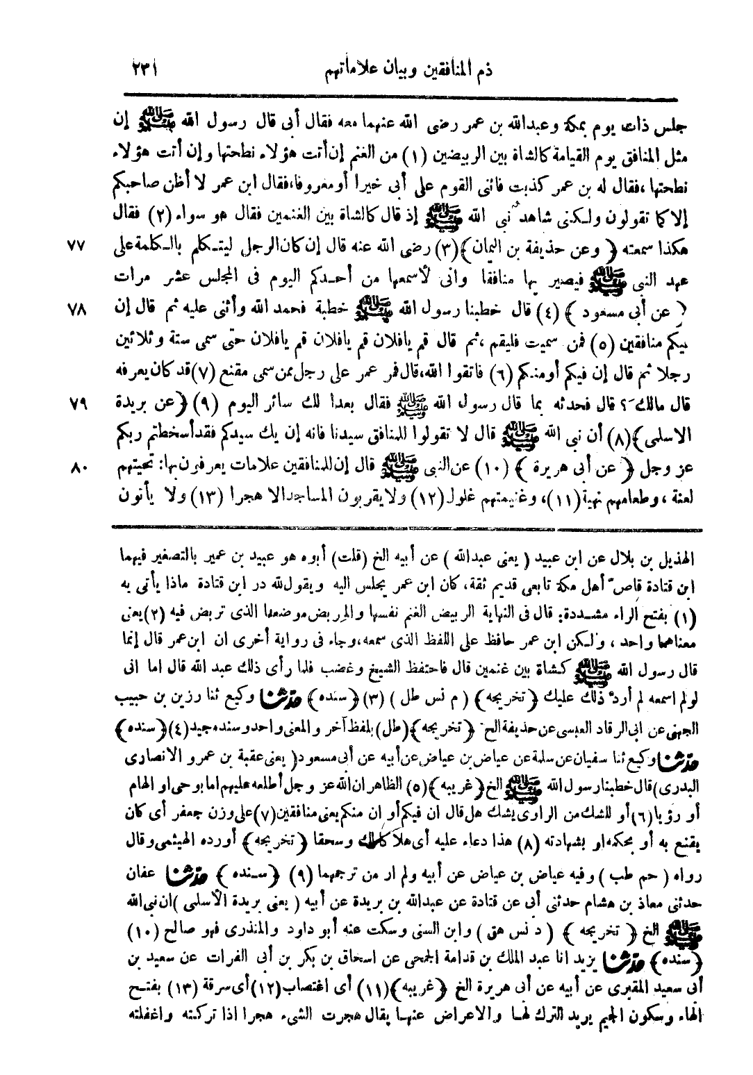 جلس ذات يوم بمكة وعبد الله بن عمر رضي الله عنهما معه فقال أبي قال رسول الله صلى الله عليه وسلم إن مثل المنافق يوم القيامة كالشاة بين الربيضين (1) من الغنم إن اتت هؤلاء نطحتها وإن أتت هؤلاء نطحتها فقال له بن عمر كذبت فأثنى القوم على أبي خيرا أو معروفا فقال ابن عمر لا اظن صاحبكم إلا كما تقولون ولكني شاهد نبي الله صلى الله عليه وسلم إذ قال كالشاة بين الغنمين فقال هو سواء (2) فقال هكذا سمعته (وعن حذيفة بن اليمان) (3) رضي الله عنه قال إن كان الرجل ليتكلم بالكلمة على عهد النبي صلى الله عليه وسلم فيصير بها منافقا واني لاسمعها من أحدكم اليوم في المجالس عشر مرات (عن أبي مسعود) (4) قال خطبنا رسول الله صلى الله عليه وسلم خطبة فحمد الله وأثنى عليه ثم قال إن فيكم منافقين (5) فمن سميت فليقم ثم قال قم يا فلان قم يافلان قم يا فلان حتى سمى ستة وثلاثين رجلا ثم قال إن فيكم أو منكم (6) فاتقوا الله قال فمر عمر على رجل ممن سمى مقنع (7) قد كان يعرفه قال مالك؟ قال فحدثه بما قال رسول الله صلى الله عليه وسلم فقال بعدا لك سائراليوم (9) (عن بريدة الأسلمي) (8) أن نبي الله صلى الله عليه وسلم قال لا تقولوا للمنافق سيدنا فإنه إن يك سيدكم فقد أسخطتم ربكم عز وجل (عن أبي هريرة) (10) عن النبي صلى الله عليه وسلم قال إن للمنافقين علامات يعرفون بها تحيتهم لعنة وطعامهم نهية (11) وغنيمتهم غلول (12) ولا يقربون المساجد الا هجرا (13) ولا يأتون