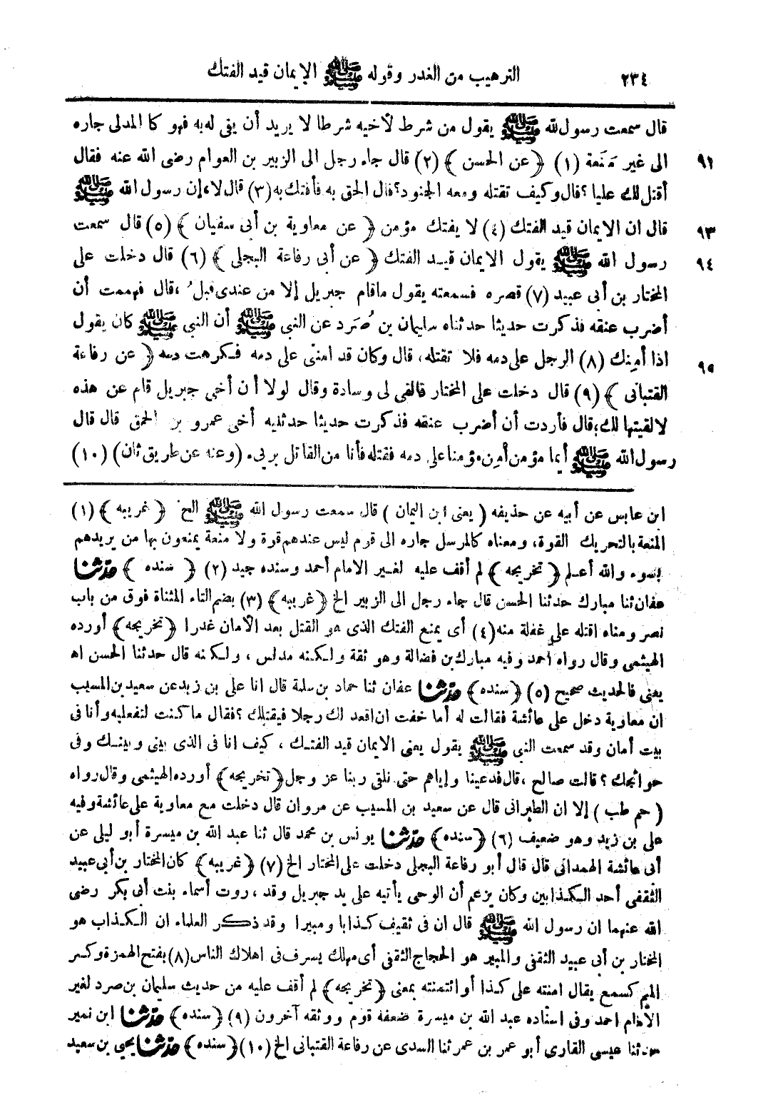 ابن عباس عن أبيه عن حذيفه (يعني ابن اليمان) قال سمعت رسول الله صلى الله عليه وسلم الخ (غريبه) (1) المنعة بالتحريك القوة ومعناه كالمرسل جاره إلى قوم ليس عندهم قوة ولا منعة يمنعون بها من يريدهم بسوء والله أعلم (تخريجه) لم أقف عليه لغير الامام احمد وسنده جيد (2) (سنده) حدثنا عفان ثنا مبارك حدثنا الحسن قال جاء رجل إلى الزبير الخ (غريبه) (3) بضم التاء المثناة فوق من باب نصر ومناه اقتله على غفلة منه (4) أي يمنع الفتك الذي هو القتل بعد الامان غدرا (تخريجه) أورده الهيثمي وقال رواه احمد وفيه مبارك بن فضالة وهو ثقة ولكن مدلس ولكنه قال حدثنا الحسن اهـ يعني فالحديث صحيح (5) (سنده) حدثنا عفان ثنا حماد بن سلمة قال انا علي بن زيد عن سعيد بن المسيب ان معاوية دخل على عائشة فقالت له اما خفت ان اقعد لك رجلا فيقتلك؟ فقال ما كنت لتفعليه وأنا في بيت أمان وقد سمعت النبي صلى الله عليه وسلم يقول يعني الايمان قيد الفتك كيف انا في الذي بيني وبينك وفي حوائجك؟ قالت صالح قال فدعينا واياهم حتى نلقى ربنا عز وجل (تخريجه) أورده الهيثمي وقال رواه (حم طب) إلا أن الطبراني قال عن سعيد بن المسيب عن مروان قال دخلت مع معاوية على عائشة وفيه علي بن زيد وهو ضعيف (6) (سنده) حدثنا يونس بن محمد قال ثنا عبد الله بن ميسرة أو ليلى عن أبي عائشة الهمداني قال قال أبو رفاعة البجلي دخلت على المختار الخ (7) (غريبه) كان المختار بن أبي عبيد الثقفي أحد الكذابين وكان يزعم أن الوحي يأتيه على يد جبريل وقد روت أسماء بنت أبي بكر رضي الله عنهما أن رسول الله صلى الله عليه وسلم قال ان في ثقيف كذابا ومبيرا وقد ذكر العلماء ان الكذاب هو المختار بن أبي عبيد الثقفي والمبير هو الحجاج الثقفي اي مهلك يسرف في اهلاك الناس (8) بفتح الهمزة وكسرالميم كسمع يقال امنته على كذا أو أئتمنته بمعنى (تخريجه) لم أقف عليه من حديث سليمان بن صرد لغير الامام احمد وفي اسناده عبد الله بن ميسرة ضعفه قوم ووثقه آخرون (9) (سنده) حدثنا ابن نيمر حدثنا عيسى القارى ابو عمر بن عمر ثنا السدى عن رفاعة القتباني الخ (10) (سنده) حدثنا يحيى بن سعيد
