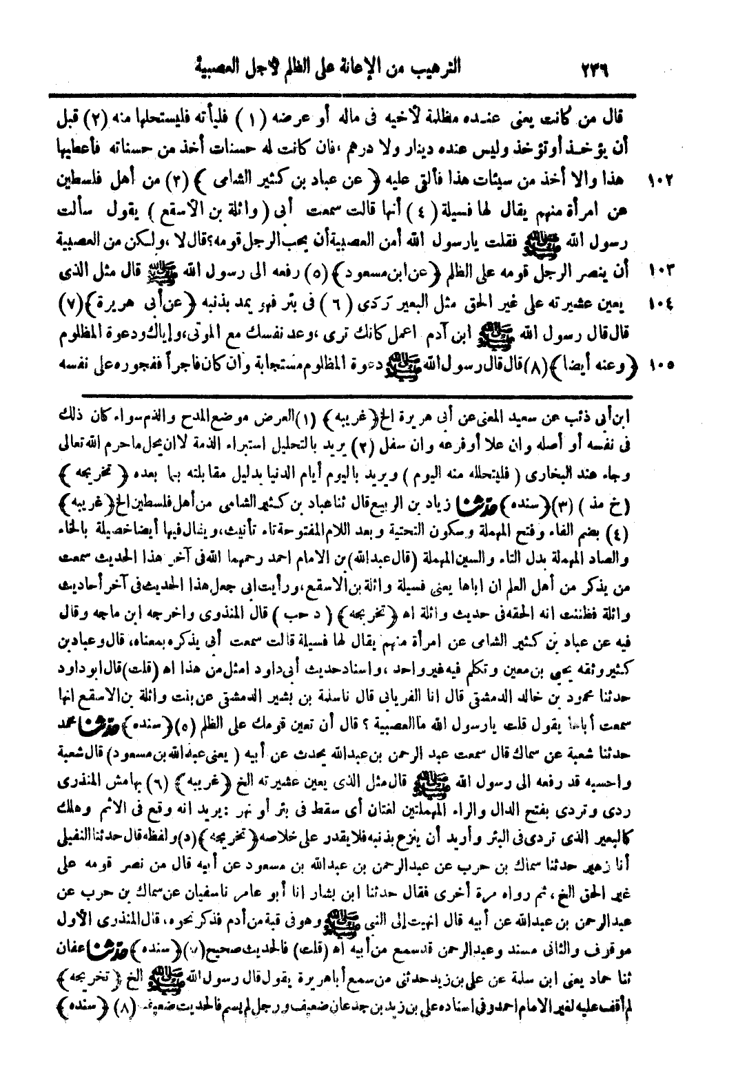 ابن أبي ذئب عن سعيد المعنى عن أبي هريرة الخ (غريبه) (1) العرض موضع المدح والذم سواء كان ذلك في نفسه أو أصله وان علا أو فرعه وان سفل (2) يريد بالتحليل استبراء الذمة لا ان يحل ما حرم الله تعالى وجاء عند البخاري (فليتحلله منه اليوم) ويريد باليوم أيام الدنيا بدليل مقابلته بما بعده (تخريجه) (خ مذ) (3) (سنده) حدثنا زياد بن الربيع قال ثنا عباد بن كثير الشامي من أهل فلسطين الخ (غريبه) (4) بضم الفاء وفتح المهملة وسكون التحتية وبعد اللام المفتوحة تاء تأنيث ويقال فيها أيضا خصيلة بالخاء والصاد المهملة بدل التاء والسين المهملة (قال عبد الله) بن الامام احمد رحمهما الله في آخر هذا الحديث سمعت من يذكر من أهل العلم ان اباها يعني فسيلة وائلة بن الاسقع ورأيت ابي جعل هذا الحديث في آخر أحاديث وائلة فظننت انه الحقة في حديث وائلة اهـ (تخريجه) (د حب) قال المنذري واخرجه ابن ماجه وقال فيه عن عباد بن كثير الشامي عن امرأة منهم يقال لها فسيلة قالت سمعت أبي يذكره بمعناه قال وعباد بن كثير وثقه يحيى بن معين وتكلم فيه غير واحد واسناد حديث ابي داود امثل من هذا اهـ (قلت) قال ابو داود حدثنا محمود بن خالد الدمشقي قال انا الفريابي قال ناسمة بن بشير الدمشقي عن بنت وائلة بن الاسقع انها سمعت اباها يقول قلت يا رسول الله ما العصبية؟ قال أن تعين قومك على الظلم (5) (سنده) حدثنا محمد حدثنا شعبة عن سماك قال سمعت عبد الرحمن بن عبد الله يحدث عن أبيه (يعني عبد الله بن مسعود) قال شعبة واحسبه قد رفعه إلى رسول الله صلى الله عليه وسلم قال مثل الذي يعين عشيرته الخ (غريبه) (6) بهامش المنذري ردى وتردى بفتح الدال والراء المهملتين لغتان أي سقط في بئر أو نهر يريد أنه وقع في الاثم وهلك كالبعير الذي تردى في البئر وأريد أن ينزع بذنبه فلا يقدر على خلاصه (تخريجه) (د) ولفظه قال حدثنا النفيلي أنا زهير حدثنا سماك بن حرب عن عبد الرحمن عن عبد الله بن مسعود عن أبيه قال من نصر قومه على غير الحق الخ ثم رواه مرة أخرى فال حدثنا ابن بشار انا ابو عامر ناسفيان عن سماك بن حرب عن عبد الرحمن بن عبد الله عن أبيه قال انهيت إلى النبي صلى الله عليه وسلم وهو في قبة من أدم فذكر نحره قال المنذري الأول موقوف والثاني مسند وعبد الرحمن قد سمع من أبيه اهـ (قلت) فالحديث صحيح (7) (سنده) حدثنا عفان ثنا حماد يعني ابن سلمة عن علي بن زيد حدثني من سمع أبا هريرة يقول قال رسول الله صلى الله عليه وسلم الخ (تخريجه) لم اقف عليه لغير الامام احمد وفي اسناده علي بن زيد بن جدعان ضعيف ورجل لم يسم فالحديث ضعيف (8) (سنده)