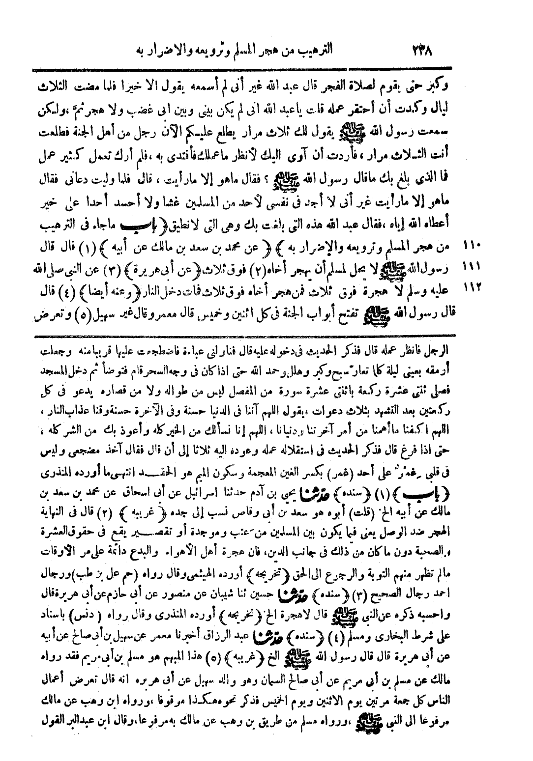 الرجل فانظر عمله قال فذكر الحديث في دخوله عليه قال فناولني عباءة فاضطجعت عليها قريبا منه وجعلت ارمقه بعيني ليلة كلما تعار سبح وكبر وهلل وحمد الله حتى اذا كان في وجه السحر قام فتوضأ ثم دخل المسجد فصلى ثنتي عشرة ركعة باثنتي عشرة سورة من المفصل ليس من طواله ولا من قصاره يدعو في كل ركعتين بعد التشهد بثلاث دعوات يقول اللهم آتنا في الدنيا حسنة وفي الآخرة حسنة وقنا عذاب النار اللهم اكفنا ما أهمنا من أمر آخرتنا ودنيانا اللهم إنا نسألك من الخير كله وأعوذ بك من الشر كله حتى اذا فرغ قال فذكر الحديث في استقلاله عمله وعوده اليه ثلاثا إلى ان قال فقال آخذ مضجعي وليس فيقلبي غمر على أحد (غمر) بكسر الغين المعجمة وسكون الميم هو الحقد انتهى ما اورده المنذري (باب) (1) (سنده) حدثنا يحيى بن آدم حدثنا اسرائيل عن أبي اسحاق عن محمد بن سعد بن مالك عن أبيه الخ (قلت) أوبوه هو سعد بن أبي وقاص نسب غلى جده (غريبه) (2) قال في النهاية الهجر ضد الوصل يعني فيما يكون بين المسلمين من عتب وموجدة أو تقصير يقع في حقوق العشرة والصحبة دون ما كان من ذلك في جانب الدين فإن هجرة أهل الأهواء والبدع دائمة على مر الأوقات ما لم تظهر منهم التوبة والرجوع الى الحق (تخريجه) أورده الهيثمي وقال رواه (حم عل بز طب) ورجال احمد رجال الصحيح (3) (سنده) حدثنا حسين ثنا شيبان عن منصور عن أبي حازم عن أبي هريرة قال واحسبه ذكر عن النبي صلى الله عليه وسلم قال لا هجرة الخ (تخريجه) أورده المنذري وقال رواه (د نس) باسناد على شرط البخاري ومسلم (4) (سنده) حدثنا عبد الرزاق اخبرنا معمر عن سهيل بن ابي صالح عن أبيه عن أبي هريرة قال قال رسول الله صلى الله عليه وسلم الخ (غريبه) (5) هذا المبهم هو مسلم بن أبي مريم فقد رواه مالك عن مسلم بن أبي مريم عن ابي صالح السمان وهو والد سهيل عن أبي هريرة انه قال تعرض أعمال الناس كل جمعة مرتين يوم الاثنين ويوم الخميس فذكر نحوه هكذا موقوفا ورواه ابن وهب عن مالك مرفوعا الى النبي صلى الله عليه وسلم ورواه مسلم من طريق بن وهب عن مالك به مرفوعا وقال ابن عبد البر القول