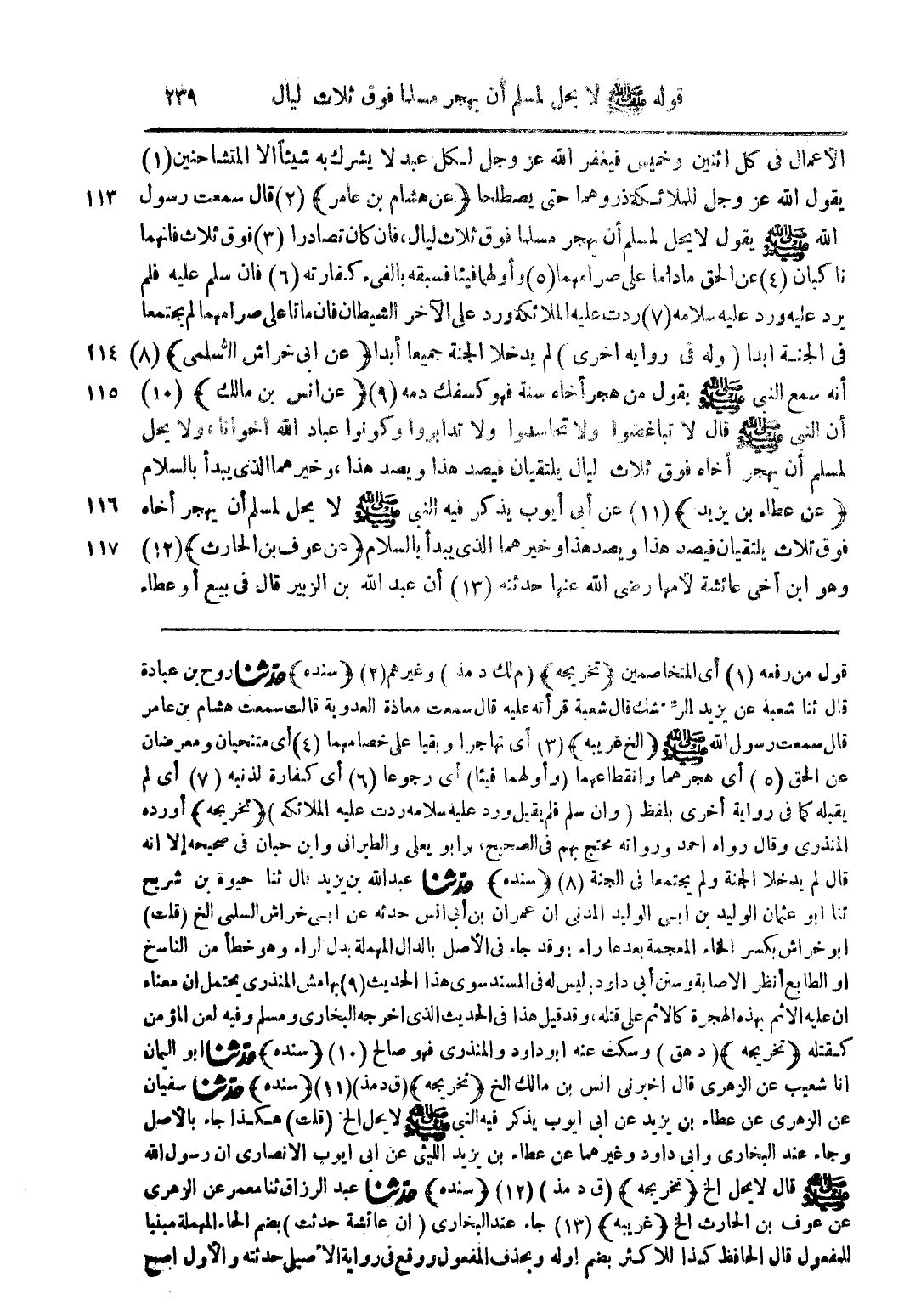 قوله من رفعه (1) أي المتخاصمين (تخريجه) (م لك د مذ) وغيرهم (2) (سنده) حدثنا روح بن عبادة قال ثنا شعبة عن يزيد الرشك قال شعبة قرأته عليه قال سمعت معاذة العدوية قالت سمعت هشام بن عامر قال سمعت رسول الله صلى الله عليه وسلم (الخ غريبه) (3) اي تهاجرا وبقيا على خصامهما (4) أي متنحيان ومعرضان عن الحق (5) أي هجرهما وانقطاعها (وأولهما فيئا) أي رجوعا (6) أي كفارة لذنبه (7) أي لم يقبله كما في رواية أخرى بلفظ (وان سلم فلم يقيل ورد عليه سلامه ردت عليه الملائكة) (تخريجه) أورده المنذري وقال رواه احمد ورواته محتج بهم في الصحيح وابو يعلي والطبراني وابن حبان في صحيحه إلا انه قال لم يدخلا الجنة ولم يجتمعا في الجنة (8) (سنده) حدثنا عبد الله بن يزيد قال ثنا حيوة بن شريح ثنا أبو عثمان الوليد بن أبي الوليد المدني ان عمران بن أبي انس حدثه عن أبي خراش السلمي الخ (قلت) ابو خراش بكسر الخاء المعجمة بعدها راء وقد جاء في الاصل بالدال المهملة بدل الراء وهو خطأ من الناسخ أو الطابع انظر الاصابة وسنن أبي داود ليس له في المسند سوى هذا الحديث (9) بهامش المندري يحتمل ان معناه ان عليه الاثم بهذه الهجرة كالاثم على قتله وقد قيل هذا في الحديث الذي اخرجه البخاري ومسلم وفيه لعن المؤمن كقتله (تخريجه) (د هق) وسكت عنه ابوداود والمنذري فهو صالح (10) (سنده) حدثنا ابو اليمان انا شعيب عن الزهري قال اخبرني انس بن مالك الخ (تخريجه) (ق د مذ) (11) (سنده) حدثنا سفيان عن الزهري عن عطاء بن يزيد عن أبي ايوب يذكر فيه النبي صلى الله عليه وسلم لا يحل الخ (قلت) هكذا جاء بالأصل وجاء عند البخاري وابي داود وغيرهما عن عطاء بن يزيد الليني عن أبي ايوب الانصاري ان رسول الله صلى الله عليه وسلم قال لا يحل الخ (تخريجه) (ق د مذ) (12) (سنده) حدثنا عبد الرزاق ثنا معمر عن الزهري عن عوف بن الحارث الخ (غريبه) (13) جاء عند البخاري (ان عائشة حدثت) بضم الحاء المهملة مبنيا للمفعول قال الحافظ كذا للاكثر بضم أوله وبحذف المفعول ووقع في رواية الاصيل حدثته والأول أصح