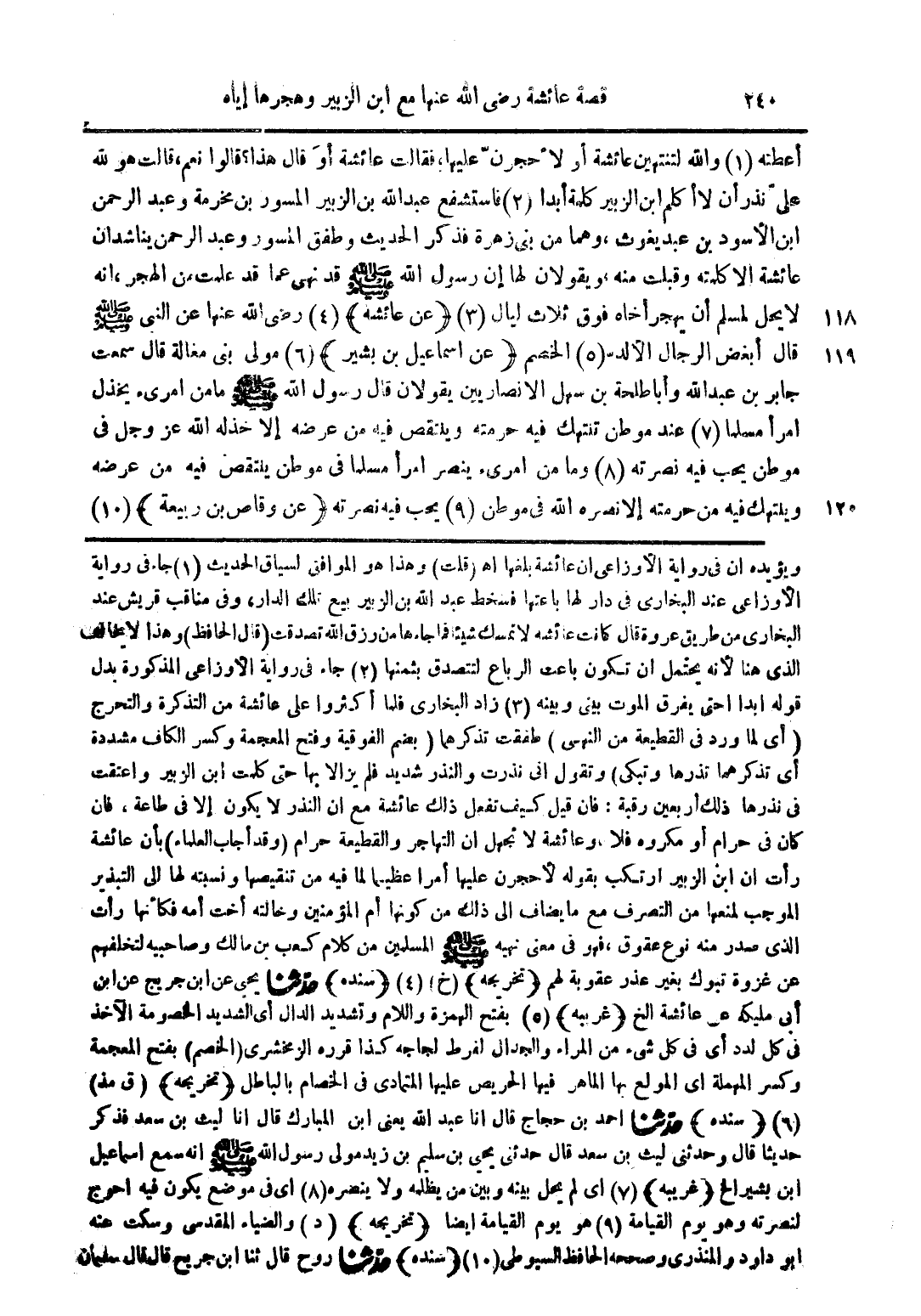 ويؤيده أن في رواية الأوزاعي ان عائشة بلغها اهـ (قلت) وهذا هو الموافق لسياق الحديث (1) جاء في رواية الأوزاعي عند البخاري في دار لها باعتها فسخط عبد الله بن الزبير بيع تلك الدار وفي مناقب قريش عند البخاري من طريق عروة قال كانت عائشة لا تمسك شيئا فما جاءها من رزق الله تصدفت (قال الحافظ) وهذا لا يخالف الذي هنا لأنه يحتمل أن تكون باعت الرباع لتتصدق بثمنها (2) جاء في رواية الاوزاعي المذكورة بدل قولها ابدا حتى يفرق الموت بيني وبينه (3) زاد البخاري فلما أكثروا على عائشة من التذكرة والتحرج (أي لما ورد في القطيعة من النهي) طفقت تذكرهما (بضم الفوقية وفتح المعجمة وكسر الكاف مشددة أي تذكرهما تذرها وتبكي) وتقول اني نذرت والنذر شديد فلم يزالا بها حتى كلمت ابن الزبير واعتقت في نذرها ذلك أربعين رقبة فإن قيل كيف تفعل ذلك عائشة مع ان النذر لا يكون إلا في طاعة فإن كان في حرام أو مكروه فلا وعائشة لا تجهل أن التهاجر والقطيعة حرام (وقد أجاب العلماء) بأن عائشة رأت أن ابن الزبير ارتكب بقوله لأحجرن عليها أمرا عظيما لما فيه من تنقيصها ونسبته لها إلى التبذير الموجب لمنعها من التصرف مع ما يضاف الى ذلك من كونها ام المؤمنين وخالته اخت امه فكأنها رأت الذي صدر منه نوع من عقوق فهو معنى نهيه صلى الله عليه وسلم المسلمين من كلام كعب بن مالك وصاحبيه لتخلفهم عن غزوة تبوك بغير عذر عقوبة لهم (تخريجه) (خ) (4) (سنده) حدثنا يحيى عن ابن جريج عن ابن أبي مليكة عن عائشة الخ (غريبه) (5) بفتح الهمزة واللام وتشديد الدال أي الشديد الخصومة الآخذ في كل لدد أي في كل شيء من المراء والجدال لفرط لجاجة كذا قرره الزمخشري (الخصم) بفتح المعجمة وكسر المهملة أي المولع بها الماهر فيها الحريص عليها المتمادي في الخصام بالباطل (تخريجه) (ق مذ) (6) (سنده) حدثنا احمد بن حجاج قال انا عبد الله يعني ابن المبارك قال انا ليث بن سعد فذكر حديثا قال وحدثني ليث بن سعد قال حدثني يحيى بن سليم بن زيد مولى رسول الله صلى الله عليه وسلم انه سمع اسماعيل ابن بشير الخ (غريبه) (7) اي لم يحل بينه وبين من يظلمه ولا ينصره (8) اي في موضع يكون فيه احوج لنصرته وهو يوم القيامة (9) هو يوم القيامة أيضا (تخريجه) (د) والضياء المقدسي وسكت عنه أبو داود والمنذري وصححه الحافظ السيوطي (10) (سنده) حدثنا روح قال ثنا ابن جريح قال قال سليمان