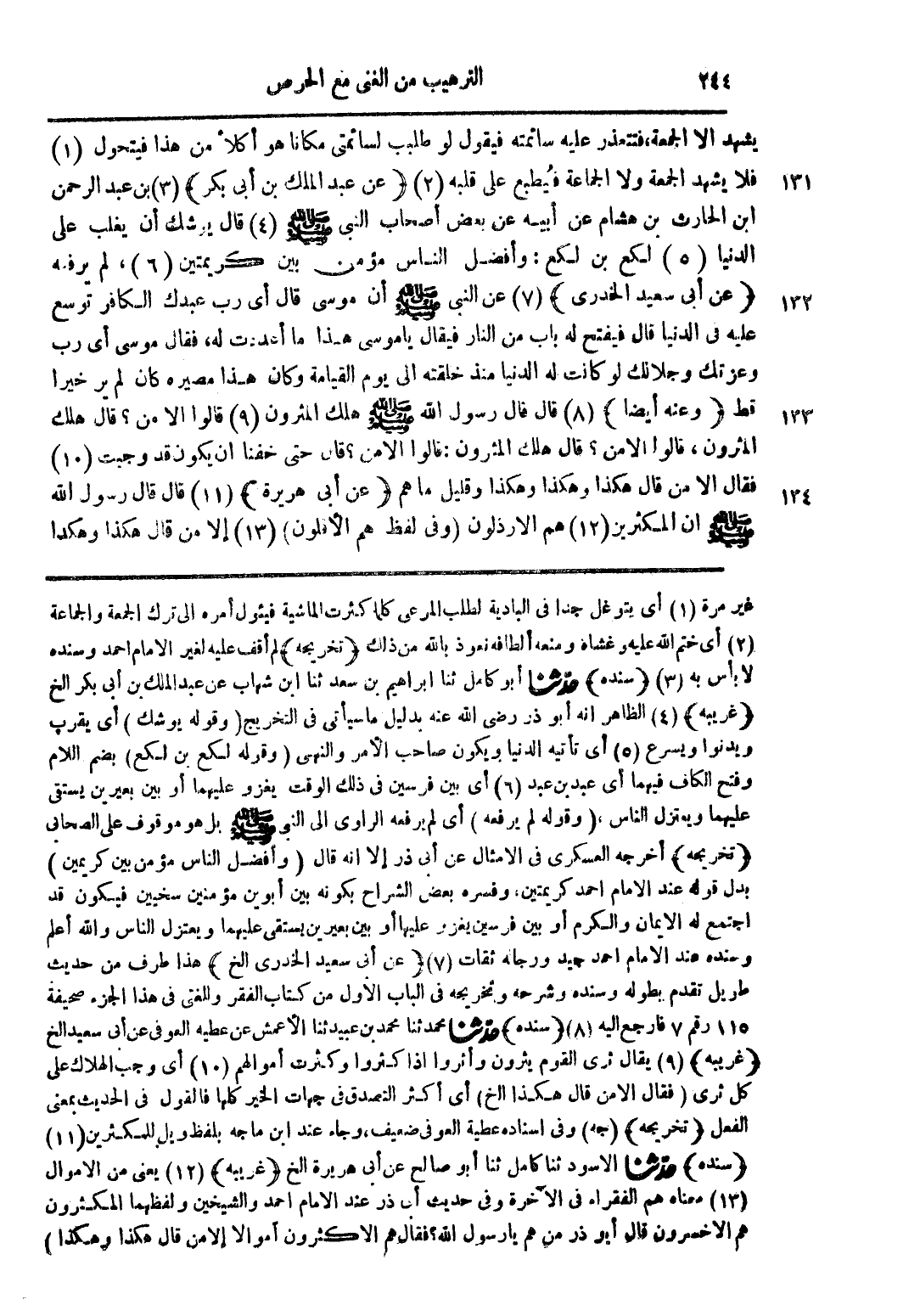 غير مرة (1) أي يتوغل جدا في البادية ليطلب المرعى كلما كثرت الماشية فيئول أمره إلى ترك الجمعة والجماعة (2) أي ختم الله عليه غشاه ومنعه ألطافه نعوذ بالله من ذلك (تخريجه) لم أقف عليه لغير الامام احمد وسنده لا بأس به (3) (سنده) حدثنا ابو كامل ثنا ابراهيم بن سعد ثنا ابن شهاب عن عبد الملك بن أبي بكر الخ (غريبه) (4) الظاهر انه أبو ذر رضي الله عنه بدليل ما سيأتي في التخريج (وقوله يوشك) أي يقرب ويدنوا ويسرع (5) أي تأتيه الدنيا ويكون صاحب الأمر والنهي (وقوله لكع بن لكع) بضم اللام وفتح الكاف فيهما أي عبد بن عبد (6) أي بين فرسين في ذلك الوقت يغزو عليهما أو بين بعيرين يستقي عليهما ويعتزل الناس (وقوله لم يرفعه) أي لم يرفعه الراوي إلى النبي صلى الله عليه وسلم بل هو موقوف على الصحابي (تخريجه) أخرجه العسكري في الامثال عن أبي ذر إلا انه قال (وأفضل الناس مؤمن بين كريمين) بدل قوله عند الامام احمد كريمتين وفسره بعض الشراح بكونه بين أبوين مؤمنين سخيين فيكون قد اجتمع له الايمان والكرم أو بين فرسين يغزو عليهما أو بين بعيرين يستقي عليهما ويعتزل الناس والله أعلم وسنده عند الامام احمد جيد ورجاله ثقات (7) (عن أبي سعيد الخدري الخ) هذا طرف من حديث طويل تقدم بطوله وسنده وشرحه وتخريجه في الباب الأول من كتاب الفقر والغنى في هذا الجزء صحيفة 115 رقم 7 فارجع اليه (8) (سنده) حدثنا محمد ثنا محمد بن عبيد ثنا الأعمش عن عطية العوفي عن أبي سعيد الخ (غريبه) (9) يقال ثرى القوم يثرون وأثروا اذا كثروا وكثرت أموالهم (10) اي وجب الهلاك على كل ثري (فقال الا من قال هكذا الخ) أي أكثر التصديق في جهات الخير كلها فالقول في الحديث بمعنى الفعل (تخريجه) (جه) وفي اسناده عطية العوفي ضعيف وجاء عند ابن ماجه بلفظ ويل للمكثرين (11) (سنده) حدثنا الاسود ثنا كامل ثنا ابو صالح عن أبي هريرة الخ (غريبه) (12) يعني من الاموال (13) معناه هم الفقراء في الآخرة وفي حديث أبي ذر عند الامام احمد والشيخين ولفظهما المكثرون هم الاخسرون قال أبو ذر من هم يا رسول الله؟ فقال هم الاكثرون أموالا إلا من قال هكذا وهكذا)