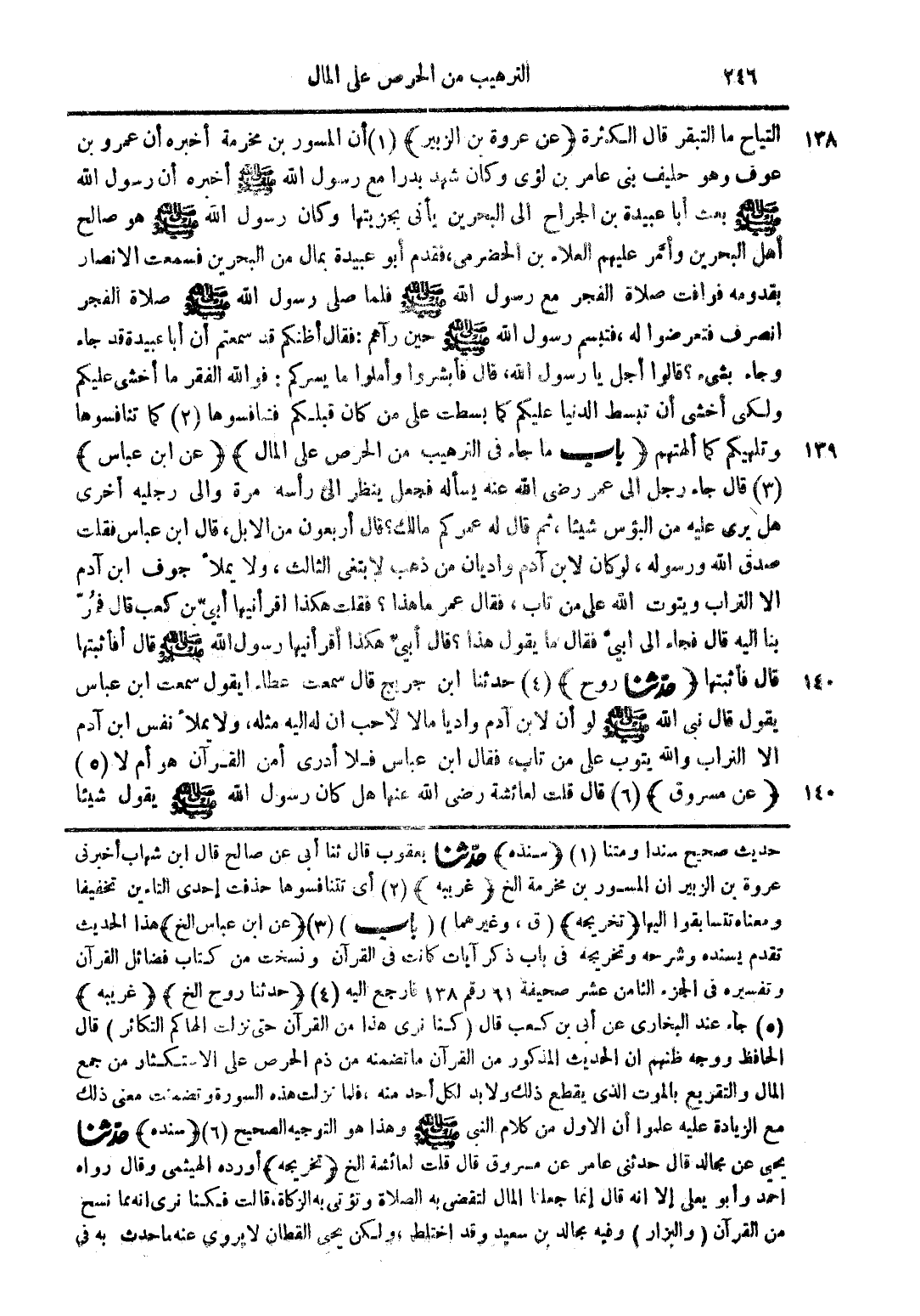 حديث صحيح سندا ومتنا (1) (سنده) حدثنا يعقوب قال ثنا أبي عن صالح قال ابن شهاب اخبرني عروة بن الزبير ان المسور بن مخرمة الخ (غريبه) (2) أي تتنافسوها حذفت احدى التاءين تخفيفا ومعناها تتسابقوا اليها (تخريجه) (ق وغيرهما) (باب) (3) (عن ابن عباس الخ) هذا الحديث تقدم بسنده وشرحه وتخريجه في باب ذكر آيات كانت في القرآن ونسخت من كتاب فضائل القرآن وتفسيره في الجزء الثامن عشر صحيفة 61 رقم 138 فارجع اليه (4) (حدثنا روح الخ) (غريبه) (5) جاء عند البخاري عن أبي بن كعب قال (كنا نرى هذا من القرآن حتى نزلت الهاكم التكاثر) قال الحافظ روجه ظنهم ان الحديث المذكور من القرآن ما تضمنه من ذم الحرص على الاستكثار من جمع المال والتقريع بالموت الذي يقطع ذلك ولا بد لكل أحد منه فلما نزلت هذه السورة وتضمنت معنى ذلك مع الزيادة عليه علموا أن الأول من كلام النبي صلى الله عليه وسلم وهذا هو التوجيه الصحيح (6) (سنده) حدثنا يحيى عن مجالد قال حدثني عامر عن مسروق قال قلت لعائشة الخ (تخريجه) أورده الهيثمي وقال رواه احمد وابو يعلي إلا انه قال انما جعلنا المال لتقضى به الصلاة وتؤتي به الزكاة قالت فكنا نرى انه مما نسمح من القرآن (والبزار) وفيه مجالد بن سعيد وقد اختلط ولكن يحيى القطان لا يروى عنه ما حدث به في