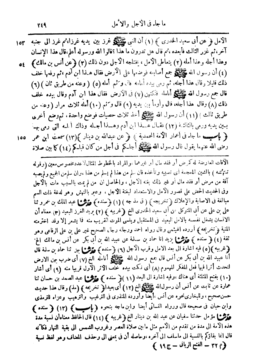الأمل (عن أبي سعيد الخدري) (1) أن النبي صلى الله عليه وسلم غرز بين يديه غرزا ثم غرز الى جنبه آخر ثم غرز الثالث فأبعده ثم قال هل تدرون ما هذا؟ قالوا الله ورسوله أعلم قال هذا الانسان وهذا أجله وهذا أمله (2) يتعاطى الأمل يختلجه الأجل دون ذلك (3) (عن أنس بن مالك) (4) ان رسول الله صلى الله عليه وسلم جمع أصابعه فوضعها على الأرض فقال هذا ابن آدم ثم رفعها خلف ذلك قليلا وقال هذا أجله ثم رمى بيده أمامه قال وثم أمله (5) (وعنه من طريق ثان) (6) قال جمع رسول الله صلى الله عليه وسلم أنامله فنكتهن (7) في الأرض فقال هذا ابن آدم وقال بيده خلف ذلك (8) وقال هذا اجله قال وأومأ بين يديه (9) قال وثم (10) أمله ثلاث مرار (وعنه من طريق ثالث) (11) أن رسول الله صلى الله عليه وسلم أخذ ثلاث حصيات فوضع واحدة ثم وضع أخرى بين يديه ورمى بالثالثة (12) فقال هذا ابن آدم وهذا أجله وذاك أمله التي رمى بها (باب ما جاء في اعمار الأمة المحمدية) (عن عبد الله بن دينار) (13) سمعت ابن عمر رضي الله عنهما يقول قال رسول الله صلى الله عليه وسلم أجلكم في أجل من كان قبلكم (14) كما بين صلاة