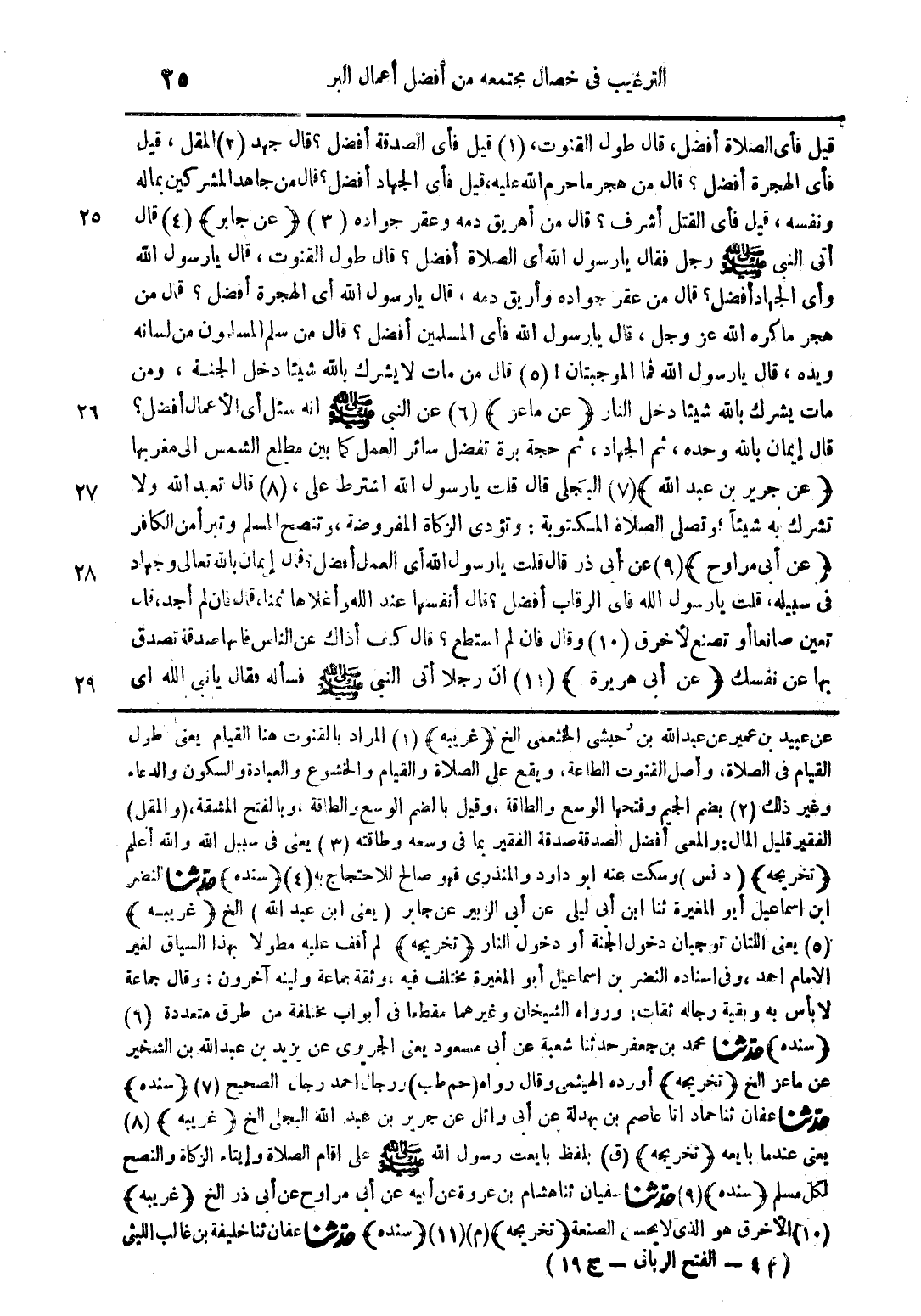 قيل فأي الصلاة أفضل قال طول القنوت (1) قيل أي الصدقة أفضل؟ قال جهد (2) المقل قيل فأي الهجرة أفضل؟ قال من هجر ما حرم الله عليه قيل فأي الجهاد أفضل؟ قال من جاهد المشركين بماله ونفسه قيل فأي القتل أشرف؟ قال من أهريق دمه وعقر جواده (3) (عن جابر) (4) قال أتى النبي صلى الله عليه وسلم رجل فقال يا رسول الله أي الصلاة أفضل؟ قال طول القنوت قال يا رسول الله وأي الجهاد أفضل؟ قال من عقر جواده وأريق دمه قال يا رسول الله أي الهجرة أفضل؟ قال من هجر ما كره الله عز وجل قال يا رسول الله فأي المسلمين أفضل؟ قال من سلم المسلمون من لسانه ويده قال يا رسول الله فما الموجبتان! (5) قال من مات لا يشرك بالله شيئا دخل الجنة ومن مات يشرك بالله شيئا دخل النار (عن ماعز) (6) عن النبي صلى الله عليه وسلم أنه سئل أي الأعمال أفضل؟ قال إيمان بالله وحده ثم الجهاد ثم حجة برة تفضل سائر العمل كما بين مطلع الشمس إلى مغربها (عن جابر بن عبد الله) (7) البجلي قال قلت يا رسول الله اشترط علي (8) قال تعبد الله ولا تشرك به شيئا وتصلي الصلاة المكتوبة وتؤدي الزكاة المفروضة وتنصح المسلم وتبرأ من الكافر (عن أبي مراوح) (9) عن أبي ذر قال قلت يا رسول الله أي العمل أفضل قال إيمان بالله تعالى وجهاد في سبيله قلت يا رسول الله فأي الرقاب أفضل؟ قال أنفسها عند الله واغلاها ثمنا قال فإن لم أجد قال تعين صانعا أو تصنع لأخرق (10) وقال فإن لم استطع؟ قال كف أذاك عن الناس فإنها صدقة تصدق بها عن نفسك (عن أبي هريرة) (11) أن رجلا أتى النبي صلى الله عليه وسلم فسأله فقال يا نبي الله أي