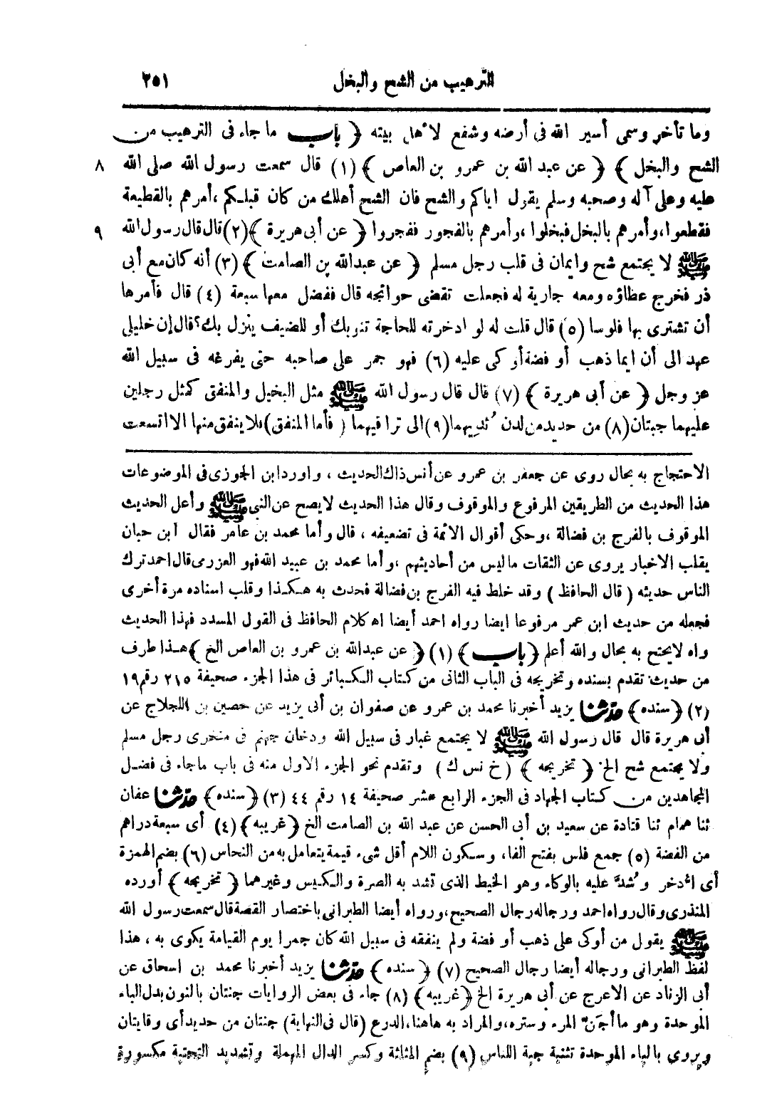 الاحتجاج به محال روى عن جعفر بن عمرو عن أنس ذاك الحديث وأورد ابن الجوزي في الموضوعات هذا الحديث من الطريقين المرفوع والموقوف وقال هذا الحديث لا يصح عن النبي صلى الله عليه وسلم وأعل الحديث الموقوف بالفرج بن فضالة وحكى أقوال الائمة في تضعيفه قال وأما محمد بن عامر فقال ابن حبان يقلب الاخبار يروى عن الثقات ما ليس من أحاديثهم وأما محمد بن عبيد الله فهو العزرمى قال احمد ترك الناس حديثه (قال الحافظ) وقد خلط فيه الفرج بن فضالة فحدث به هكذا وقلب اسناده مرة اخرى فجعله من حديث ابن عمر مرفوعا ايضا رواه احمد اهـ كلام الحافظ في القول المسدد فهذا الحديث واه لا يحتج به محال والله أعلم (باب) (1) (عن عبد الله بن عمرو بن العاص الخ) هذا طرف من حديث تقدم بسنده وتخريجه في الباب الثاني من كتاب الكبائر في هذا الجزء صحيفة 215 رقم 19 (2) (سنده) حدثنا يزيد أخبرنا محمد بن عمرو عن صفوان بن أبي يزيد عن حصين بن اللجلاج عن ابي هريرة قال قال رسول الله صلى الله عليه وسلم لا يجتمع غبار في سبيل الله ودخان جهنم في منخري رجل مسلم ولا يجتمع شح الخ (تخريجه) (خ نس ك) وتقدم نحو الجزء الأول منه في باب ماجاء في فضل المجاهدين من كتاب الجهاد في الجزء الرابع عشر صحيفة 14 رقم 44 (3) (سنده) حدثنا عفان ثنا همام ثنا قتادة عن سعيد بن أبي الحسن عن عبد الله بن الصامت الخ (غريبه) (4) أي سبعة دراهم من الفضة (5) جمع فلس بفتح الفا وسكون اللام أقل شيء قيمة يتعامل به من النحاس (6) بضم الهمزة اي ادخر وشد عليه بالوكاء وهو الخيط الذي تشد به الصرة والكيس وغيرهما (تخريجه) أورده المنذري وقال رواه احمد ورجاله رجال الصحيح ورواه ايضا الطبراني باختصار القصة قال سمعت رسول الله صلى الله عليه وسلم يقول من أوكى على ذهب أو فضة ولم ينفقه في سبيل الله كان جمرا يوم القيامة يكوى به هذا لفظ الطبراني ورجاله ايضا رجال الصحيح (7) (سنده) حدثنا يزيد أخبرنا محمد بن اسحاق عن ابي الزناد عن الاعرج عن أبي هريرة الخ (غريبه) (8) جاء في بعض الروايات جنتان من حديد أي وقابتان ويروى بالياء الموحدة تثنية جبة اللباس (9) بضم المثلثة وكسر الدال المهملة وتشديد التحتية مكسورة