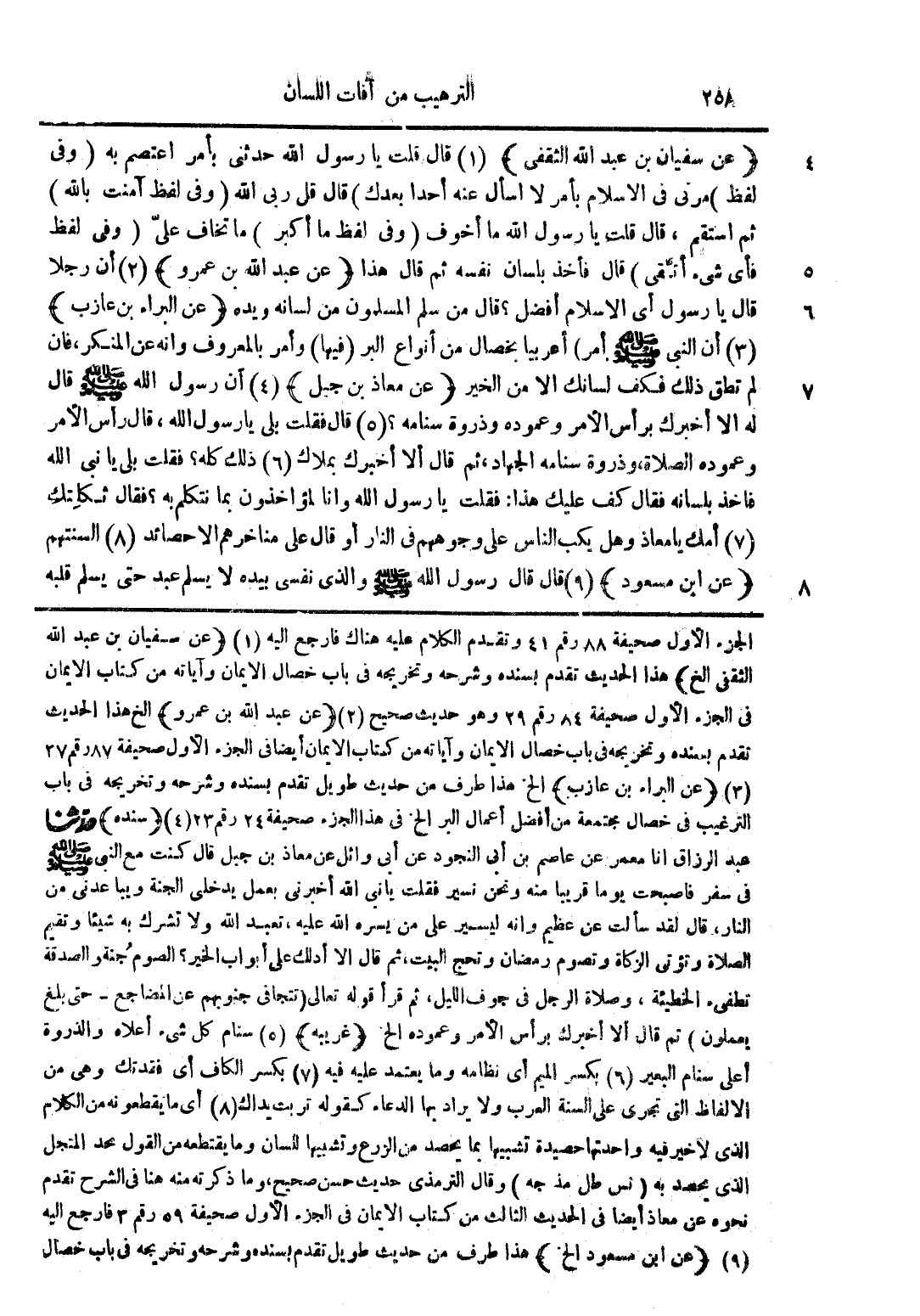 (عن سفيان بن عبد الله الثقفي) (1) قال قلت يا رسول الله حدثني بأمر اعتصم به (وفي لفظ) مرني في الاسلام بأمر لا أسأل عنه أحدا بعدك قال قل ربي الله (وفي لفظ آمنت بالله) ثم استقم قال قلت يا رسول الله ما أخوف (وفي لفظ ما أكبر) ما تخاف علي (وفي لفظ فأي شيء اتقي) قال فأخذ بلسان نفسه ثم قال هذا (عن عبد الله بن عمرو) (2) أن رجلا قال يا رسول الله اي الاسلام أفضل؟ قال من سلم المسلمون من لسانه ويده (عن البراء بن عازب) (3) أن النبي صلى الله عليه وسلم أمر أعرابيا بخصال من أنواع البر (فيها) وأمر بالمعروف وانه عن المنكر فان لم تطق ذلك فكف لسانك إلا من الخير (عن معاذ بن جبل) (4) أن رسول الله صلى الله عليه وسلم قال له الا اخبرك برأس الأمر وعموده وذروة سنامه؟ (5) قال فقلت بلى يا رسول الله قال رأس الأمر وعموده الصلاة وذروة سنامه الجهاد ثم قال ألا اخبرك بملاك (6) ذلك كله؟ فقلت بلى يا نبي الله فأخذ بلسانه فقال كف عليك هذا فقلت يا رسول الله وانا لمؤاخذون بما نتكلم به؟ فقال ثكلتك (7) أمك يا معاذ وهل يكب الناس على وجوههم في النار أو قال على مناخرهم الا حصائد (8) السنتهم (عن ابن مسعود) (9) قال قال رسول الله صلى الله عليه وسلم والذي نفسي بيده لا يسلم عبد حتى يسلم قلبه