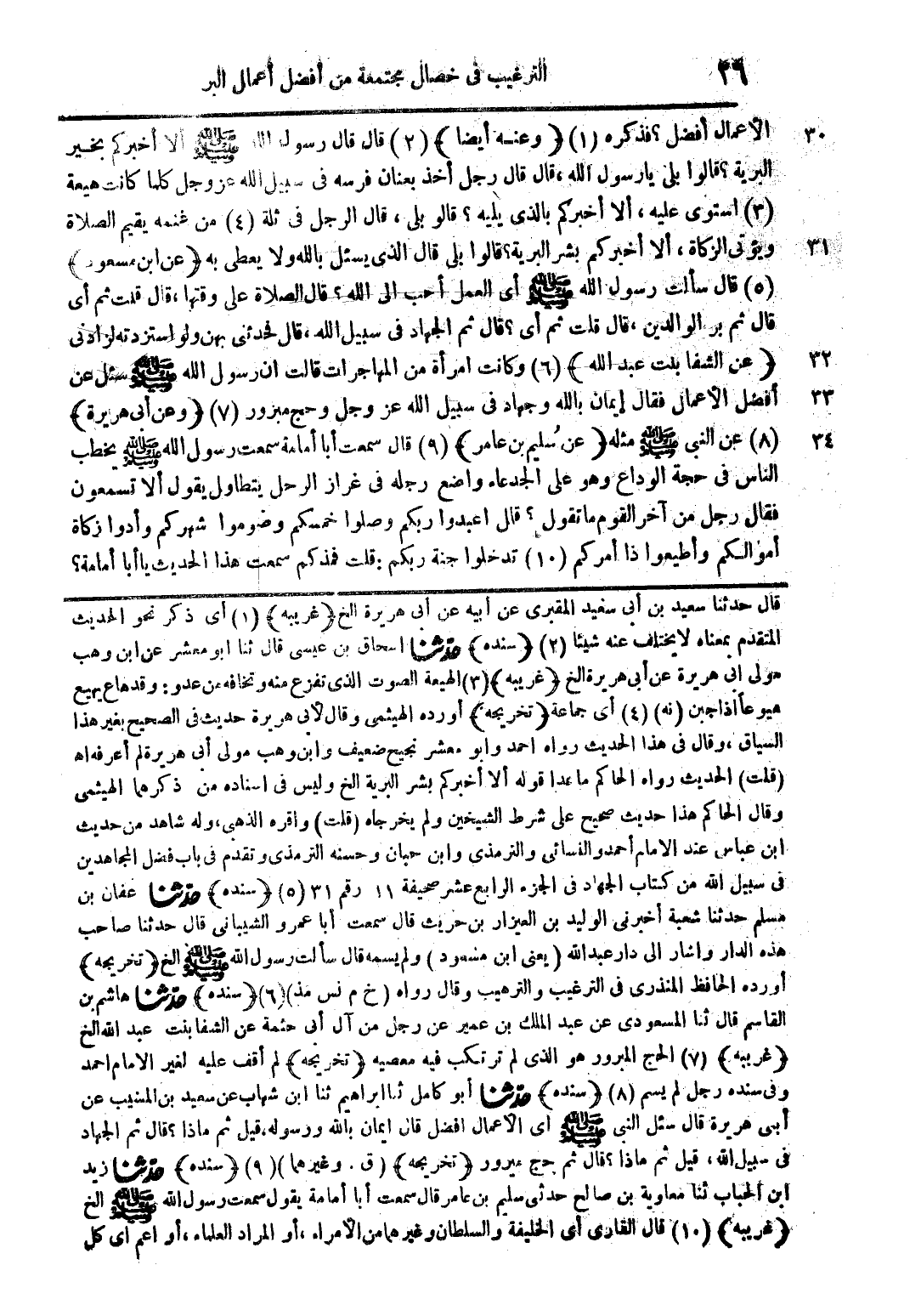 الأعمال أفضل؟ فذكره (1) (وعنه أيضا) (2) قال قال رسول الله صلى الله عليه وسلم ألا أخبركم بخير البرية؟ قالوا بلى يا رسول الله قال قال رجل أخذ بعنان فرسه في سبيل الله عز وجل كلما كانت هيعة (3) استوى عليه ألا أخبركم بالذي يليه؟ قالوا بلى قال رجل في تلة (4) من غنمه يقيم الصلاة ويؤتي الزكاة ألا أخبركم بشر البرية؟ قالوا بلى قال الذي يسأل بالله ولا يعطي به (عن ابن مسعود) (5) قال سألت رسول الله صلى الله عليه وسلم أي العمل أحب إلى الله؟ قال الصلاة على وقتها قال قلت ثم أي قال ثم بر الوالدين قال قلت ثم أي؟ قال ثم الجهاد في سبيل الله قال فحدثني بهن ولو استزدته لزادني (عن الشفا بنت عبد الله) (6) وكانت امرأة من المهاجرات قالت أن رسول الله صلى الله عليه وسلم سئل عن أفضل الأعمال فقال إيمان بالله وجهاد في سبيل الله عز وجل وحج مبرور (7) (وعن أبي هريرة) (8) عن النبي صلى الله عليه وسلم مثله (عن سليم بن عامر) (9) قال سمعت أبا أمامة سمعت رسول الله صلى الله عليه وسلم يخطب الناس في حجة الوداع وهو على الجدعاء واضع رجله في غراز الرحل يتطاول يقول ألا تسمعون فقال رجل من آخر القوم ما تقول؟ قال اعبدوا ربكم وصلوا خمسكم وصوموا شهركم وأدوا زكاة أموالكم وأطيعوا إذا أمركم (10) تدخلوا جنة ربكم قلت فمذ كم سمعت هذا الحديث يا أبا أمامة؟