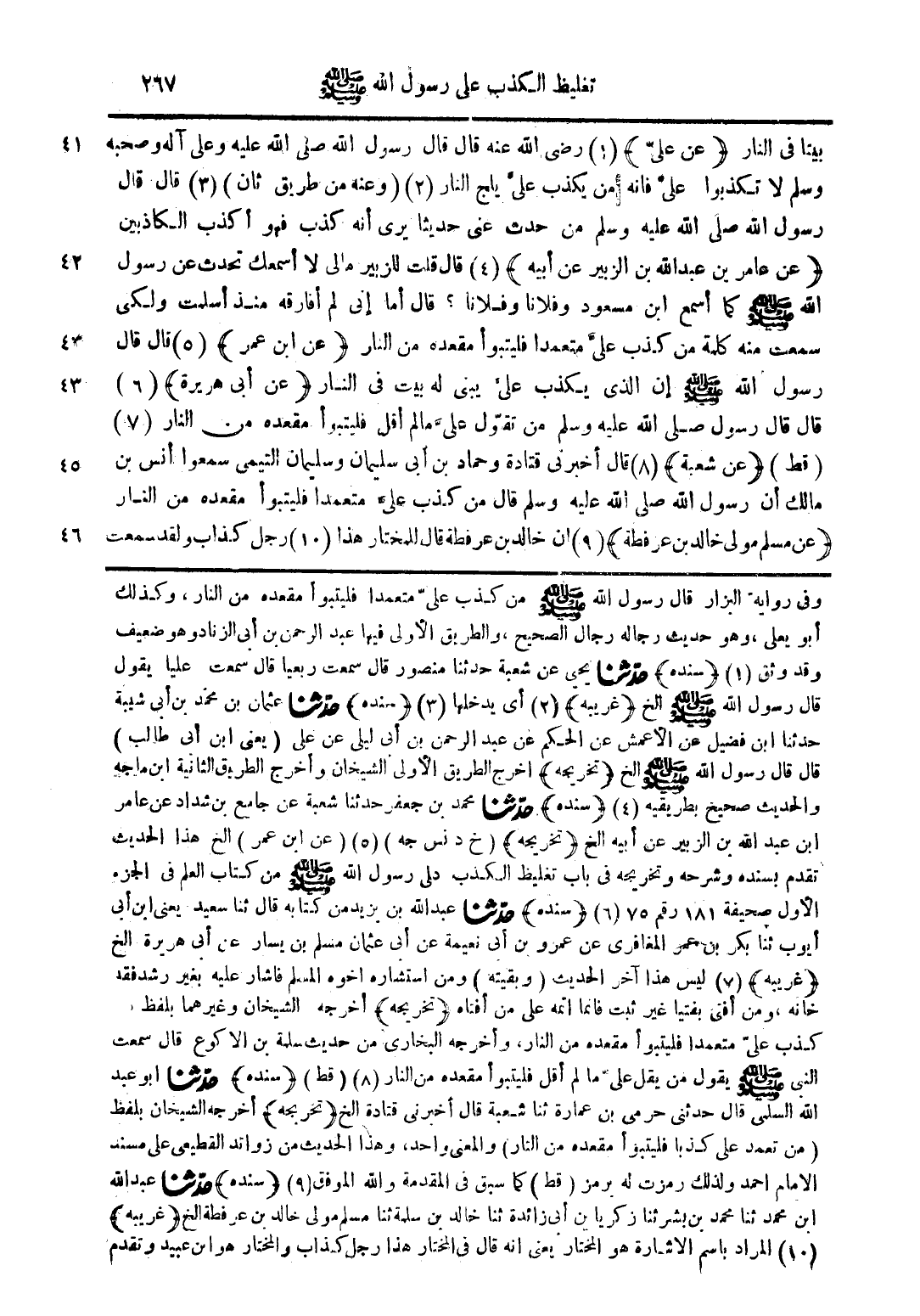 بيتا في النار (عن علي) (1) رضي الله عنه قال قال رسول الله صلى الله عليه وعلى آله وصحبه وسلم لا تكذبوا علي فإنه من يكذب علي يلج النار (2) (وعنه من طريق ثان) (3) قال قال رسول الله صلى الله عليه وسلم من حدث عني حديثا يرى أنه كذب فهو أكذب الكاذبين (عن عامر بن عبد الله بن الزبير عن أبيه) (4) قال قلت للزبير مالي لا أسمعك تحدث عن رسول الله صلى الله عليه وسلم كما اسمع ابن مسعود وفلانا وفلانا؟ قال أما إني لم أفارقه منذ اسلمت ولكني سمعت منه كلمة من كذب علي معتمدا فليتبوأ مقعده من النار (عن ابن عمر) (5) قال قال رسول الله صلى الله عليه وسلم إن الذي يكذب علي يبنى له بيت في النار (عن أبي هريرة) (6) قال قال رسول الله صلى الله عليه وسلم من تقول علي ما لم أقل فليتبوأ مقعده من النار (7) (قط) (عن شعبة) (8) قال اخبرني قتادة وحماد بن أبي سليمان وسليمان التيمي سمعوا أنس بن مالك أن رسول الله صلى الله عليه وسلم قال من كذب علي متعمدا فليتبوأ مقعده من النار (عن مسلم مولى خالد بن عرفطة) (9) أن خالد بن عرفطة قال للمختار هذا (10) رجل كذاب ولقد سمعت