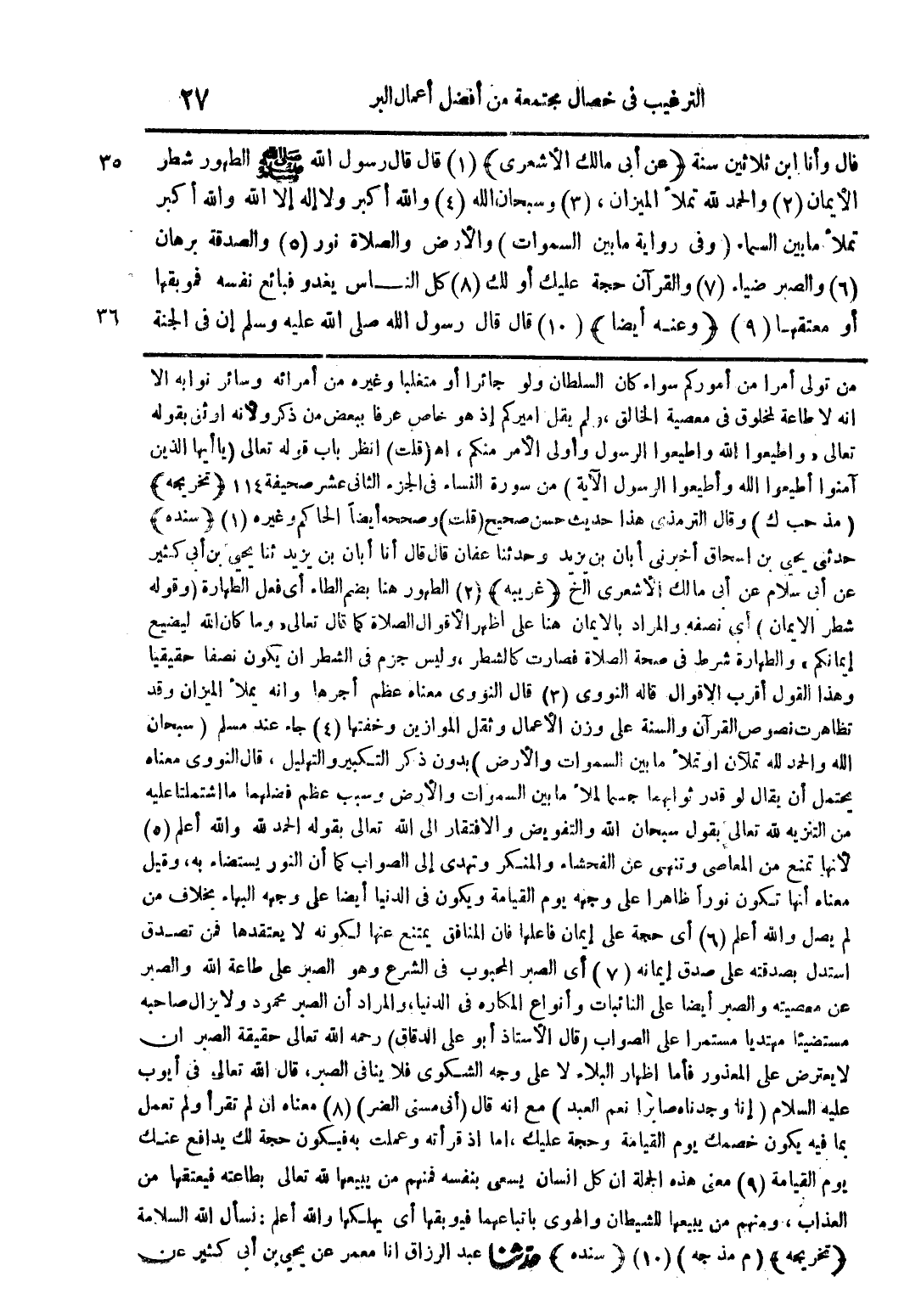من تولى أمرا من أموركم سواء كان السلطان ولو جائرا أو متغلبا وغيره من أمرئه وسائر نوابه إلا أنه لا طاعة لمخلوق في معصية الخالق ولم يقل أميركم إذ هو خاص عرفا ببعض من ذكرو لأنه أوثق بقوله تعالى (واطيعوا الله واطيعوا الرسول وأولي الأمر منكم) اهـ (قلت) انظر باب قوله تعالى (يا أيها الذين آمنوا اطيعوا الله واطيعوا الرسول الآية) من سورة النساء في الجزء الثاني عشر صحيفة 114 (تخريجه) (مذ حب ك) وقال الترمذي هذا حديث حسن صحيح (قلت) وصححه أيضا الحاكم وغيره (1) (سنده) حدثني يحيى بن اسحاق أخبرني أبان بن يزيد وحدثنا عفان قال قال أنا أبان بن يزيد ثنا يحيى بن أبي كثير عن أبي سلام عن أبي مالك الأشعري الخ (غريبه) (2) الطهور هنا بضم الطاء أي فعل الطهارة (وقوله شطر الإيمان) أي نصفه والمراد بالإيمان هنا على اطهر الاقوال الصلاة كما قال تعالى (وما كان الله ليضيع إيمانكم) والطهارة شرط في صحة الصلاة فصارت كالشطر وليس جزم في الشطر أن يكون نصفا حقيقيا وهذا أقرب الأقوال قاله النووي (3) قال النووي معناه عظم أجرها وأنه يملأ الميزان وقد تظاهرت نصوص القرآن والسنة على وزن الأعمال وثقل الموازين وخفتها (4) جاء عند مسلم (سبحان الله والحمد لله تملآن أو تملأ ما بين السموات والأرض) بدون ذكر التكبير والتهليل قال النووي معناه يحتمل أن يقال لو قدر ثوابهما جسما لملأ ما بين السموات والأرض وسبب عظم فضلها ما اشتملتا عليه من التنزيه لله تعالى بقول سبحان الله والتفويض والافتقار إلى الله تعالى بقوله الحمد لله والله أعلم (5) لأنها تمنع من المعاصي وتنهي عن الفحشاء والمنكر وتهدي إلى الصواب كما أن النور يستضاء به وقيل معناه أنها تكون نورا ظاهرا على وجهه يوم القيامة ويكون في الدنيا أيضا على وجهه البهاء بخلاف من لم يصل والله أعلم (6) أي حجة على إيمان فاعلها فإن المنافق يمتنع عنها لكونه لا يعتقدها فمن تصدق استدل بصدقته على صدق إيمانه (7) أي الصبر المحبوب في الشرع وهو الصبر على طاعة الله والصبر على معصيته والصبر أيضا على النائبات وأنواع المكاره في الدنيا والمراد أن الصبر محمود ولا يزال صاحبه مستضيئا مهتديا مستمرا على الصواب (قال الأستاذ أبو على الدقاق) رحمه الله تعالى حقيقة الصبر أن لا يعترض على المعذور فأما إظهار البلاء لا على وجه الشكوى فلا ينافي الصبر قال الله تعالى في أيوب عليه السلام (إنا وجدناه صابرا نعم العبد) مع أنه قال (إني مسني الضر) (8) معناه أن لم تقرأ ولم تعمل بما فيه يكون خصمك يوم القيامة وحجة عليك اما إذا قرأته وعملت به فيكون حجة لك يدافع عنك يوم القيامة (9) معنى هذه الجملة أن كل إنسان يسعى بنفسه فمنهم من يبيعها لله تعالى بطاعته فيعتقها من العذاب ومنهم من يبيعها للشيطان والهوى باتباعهما فيوبقهما أي يهلكها والله أعلم نسأل الله السلامة (تخريجه) (م مذ جه) (10) (سنده) حدثنا عبد الرزاق أنا معمر عن يحيى بن أبي كثير عن