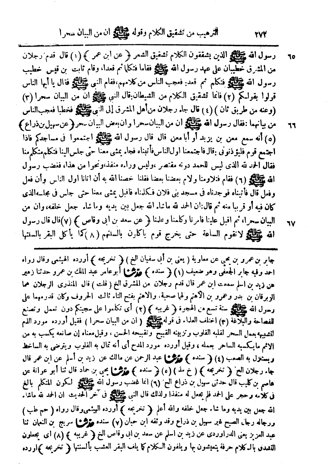 جابر بن عمرو بن يحيى عن معاوية (يعني بن أبي سفيان الخ) (تخريجه) أورده الهيثمي وقال رواه أحمد وفيه جابر الجعفي وهو ضعيف (1) (سنده) حدثنا ابو عامر عبد الملك بن عمرو حدثنا زهير عن زيد بن اسلم سمعت ابن عمر قال قدم رجلان من المشرق الخ (قلت) المنذري الرجلان هما الزبرقان بن بدر وعمرو بن الاهتم ولهما صحبة والاهتم بفتح التاء ثالث الحروف وكان قدومهما على رسول الله صلى الله عليه وسلم سنة تسع من الهجرة (غريبه) (2) أي تكلموا على سجيتكم دون تعمل وتصنع للفصاحة والبلاغة (3) اختلف العلماء في قوله صلى الله عليه وسلم (ان من البيان سحرا) فقيل أورده مورد الذم لتشبيهه بعمل الساحر لقلبه القلوب وتزيينه القبيح وتقبيحه الحسن وقيل معناه إن صانعه يكسب به من الاثم ما يكسبه الساحر بعمله وقيل أورده مورد المدح أي أنه تمال به القلوب ويترضى به الساخط ويستنزل به الصعب (4) (سنده) حدثنا عبد الرحمن عن مالك عن زيد بن أسلم عن ابن عمر قال جاء رجلان الخ (تخريجه) (خ مذ) (5) (سنده) حدثنا يحيى بن حماد قال ثنا ابو عوانة عن عاصم بن كليب قال حدثني سهيل بن ذراع الخ (6) انما غضب رسول الله صلى الله عليه وسلم لكون المتكلم بالغ في كلامه وحجر على الحمد فلم يجعل له منفذا ولذلك قال النبي صلى الله عليه وسلم في آخر الحديث ان الحمد لله ما شار الله جعل بين يديه وما شاء جعل خلفه والله أعلم (تخريجه) أورده الهيثمي وقال رواه (حم طب) ورجاله رجال الصيح غير سهيل بن ذراع وقد وثقه ابن حبان (7) سنده حدثنا سريج بن النعمان ثنا عبد العزيز يعني الدراوردي عن زيد بن اسلم عن سعد بن أبي وقاص الخ (غريبه) (8) أي يجعلون التشدق بالكلام حرفة يتعيشون بها ويلفون الكلام كما يلف البقر العشب بألسنتها (تخريجه) أورده