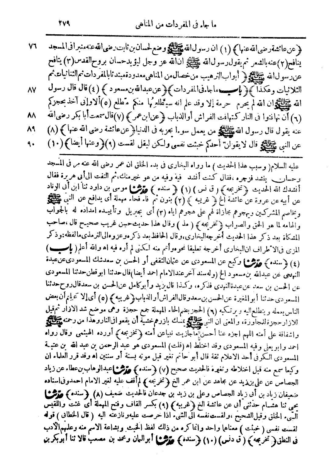 (عن عائشة رضي الله عنها) (1) أن رسول الله صلى الله عليه وسلم وضع لحسان بن ثابت رضي الله عنه منبرك في المسجد ينافح (2) عنه بالشعر ثم يقول رسول الله صلى الله عليه وسلم ان الله عز وجل ليؤيد حسان بروح القدس (3) يتافح عن رسول الله صلى الله عليه وسلم (أبوب الترهيب من خصال من المناهي معدودة مبتدئا بالمفردات ثم الثنائيات ثم الثلاثيات وهكذا) (باب ما جاء في المفردات) (عن عبد الله بن مسعود) (4) قال قال رسول الله صلى الله عليه وسلم ان الله لم يحرم حرمة إلا وقد علم انه سيطلعها منكم مطلع (5) ألا واني آخذ بحجزكم (6) أن تهافتوا في النار كتهافت الفراش أو الذباب (عن ابن عمر) (7) قال سمعت ابا بكر رضي الله عنه يقول قال رسول الله صلى الله عليه وسلم من يعمل سوءا يجز به في الدنيا (عن عائشه رضي الله عنها) (8) عن النبي صلى الله عليه وسلم قال لا يقولن أحدكم خبثت نفسي ولكن ليقل لقست (9) (وعنها أيضا) (10)