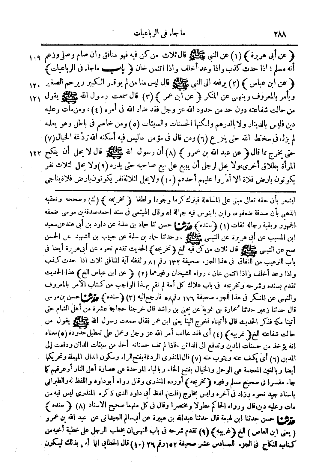 (عن أبي هريرة) (1) عن النبي صلى الله عليه وسلم قال ثلاث من كن فيه فهو منافق وان صام وصلى وزعم أنه مسلم أذا حدث كذب واذا وعد أخلف واذا ائتمن خان (باب ما جاء في الرباعيات) (عن ابن عباس) (2) يرفعه الى النبي صلى الله عليه وسلم قال ليس منا من لم يوقر الكبير ويرحم الصغير ويأمر بالمعروف وينهى عن المنكر (عن ابن عمر) (3) قال سمعت رسول الله صلى الله عليه وسلم يقول من حالت شفاعته دون حد من حدود الله عز وجل فقد ضاد الله في أمره (4) ومن مات وعليه دين فليس بالدينار ولا بالدرهم ولكنها الحسنات والسيئات (5) ومن خاصم في باطل وهو يعلمه لم يزل في سخط الله حتى ينزع (6) ومن قال في مؤمن ما ليس فيه اسكنه الله ردغه الخبال (7) حتى يخرج مما قال (عن عبد الله بن عمرو) (8) أن رسول الله صلى الله عليه وسلم قال لا يحل أن ينكح المرأة بطلان أخرى ولا يحل لرجل أن يبيع على بيع صاحبه حتى يذره (9) ولا يحل لثلاث نفر يكونون بأرض فلاة الا أمروا عليهم أحدهم (10) ولا يحل لثلاثة نفر يكونون بأرض فلاة يناجي