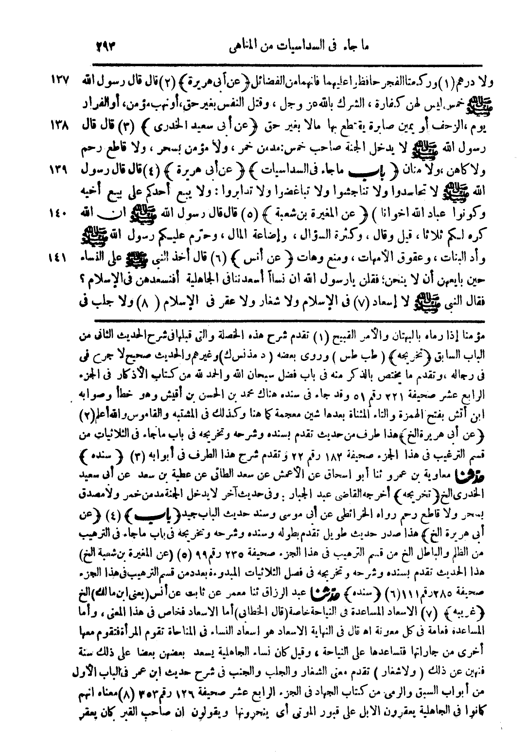 ولا درهم (1) وركعتا الفجر حافظوا عليهما فإنهما من الفضائل (عن أبي هريرة) (2) قال قال رسول الله صلى الله عليه وسلم خمس ليس لهن كفارة الشرك بالله عز وجل وقتل النفس بغير حق أو نهب مؤمن أو الفرار يوم الزحف أو يمين صابرة يقتطع بها مالا بغير حق (عن أبي سعيد الخدري) (3) قال قال رسول الله صلى الله عليه وسلم لا يدخل الجنة صاحب خمس مدمن خمر ولا مؤمن بسحر ولا قاطع رحم ولا كاهن ولا منان (باب ما جاء في السداسيات) (عن أبي هريرة) (4) قال قال رسول الله صلى الله عليه وسلم لا تحاسدوا ولا تناجشوا ولا تباغضوا ولا تدابروا ولا يبع أحدكم على بيع أخيه وكونوا عباد الله اخوانا (عن المغيرة بن شعبة) (5) قال قال رسول الله صلى الله عليه وسلم ان الله كره لكم ثلاثا قيل وقال وكثرة السؤال واضاعة المال وحرم عليكم رسول الله صلى الله عليه وسلم وأد البنات وعقوق الأمهات ومنع وهات (عن أنس) (6) قال أخذ النبي صلى الله عليه وسلم على النساء حين بايعهن أن لا ينحن فقلن يا رسول الله ان نساآ اسعدننا في الجاهلية أفنسعدهن في الاسلام؟ فقال النبي صلى الله عليه وسلم لا إسعاد (7) في الاسلام ولا شغار ولا عقر في الاسلام (8) ولا جلب في