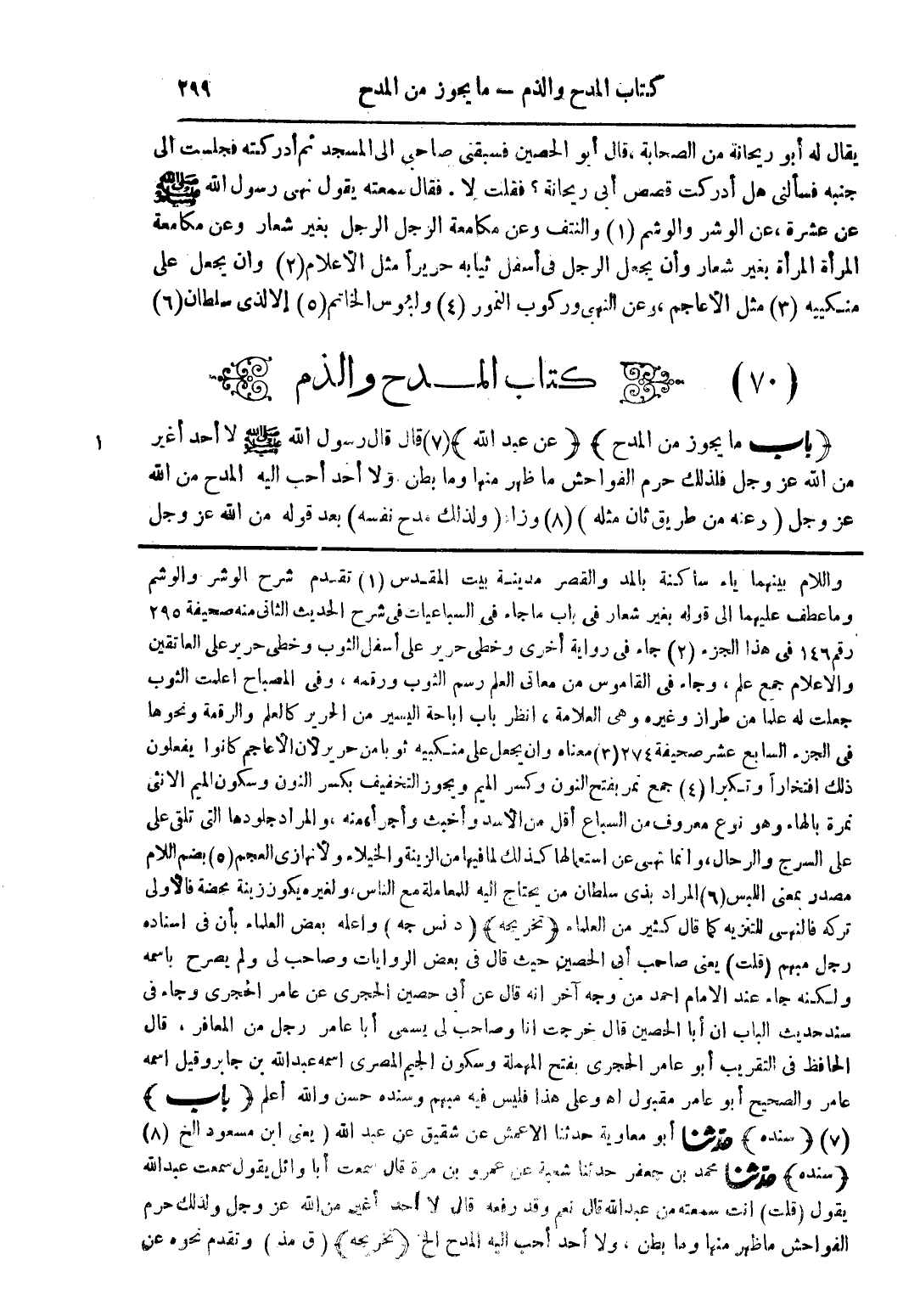 (باب ما يجوز من المدح) (عن عبد الله) (7) قال قال رسول الله صلى الله عليه وسلم لا أحد أغير من الله عز وجل فلذلك حرم الفواحش ما ظهر منها وما بطن ولا أحد أحب إليه المدح من الله عز وجل (وعنه من طريق ثان مثله) (8) وزاد (ولذلك مدح نفسه) بعد قوله من الله عز وجل