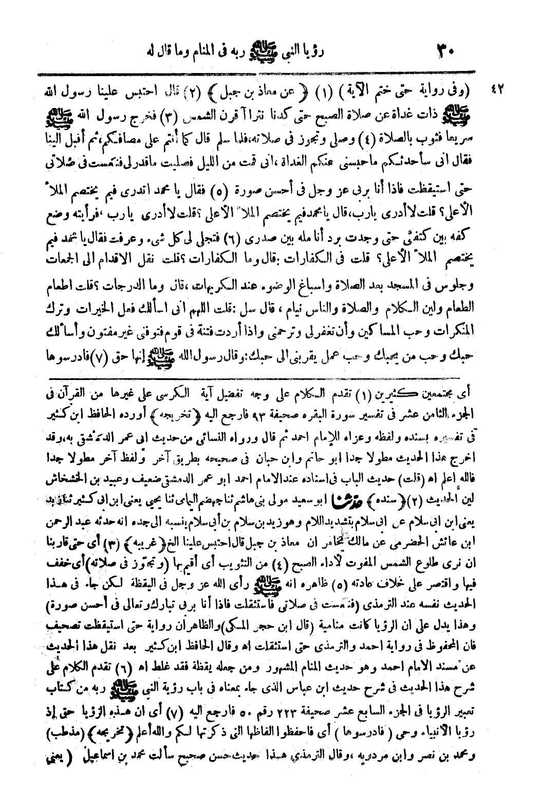 (وفي رواية حتى ختم الآية) (1) (عن معاذ بن جبل) (2) قال احتبس علينا رسول الله صلى الله عليه وسلم ذات غداة عن صلاة الصبح حتى كدنا نتراءى قرن الشمس (3) فخرج رسول الله صلى الله عليه وسلم سريعا فثوب بالصلاة (4) وتجوز في صلاته فلما سلم قال كما أنتم على مصافحكم ثم أقبل إلينا فقال إني سأحدثكم ما حبسني عنكم الغداة إني قمت من الليل فصليت ما قدر لي فنعست في صلاتي حتى استيقظت فإذا أنا بربي عز وجل في أحسن صورة (5) فقال يا محمد أتدري فيم يختصم الملأ الأعلى؟ قلت لا أدري يا رب؟ فرأيته وضع كفه بين كتفي حتى وجدت برد أنامله بين صدري (6) فتجلى لي كل شيء وعرفت فقال يا محمد فيم يختصم الملأ الأعلى؟ قلت في الكفارات قال وما الكفارات؟ قلت نقل الأقدام إلى الجمعات وجلوس في المسجد بعد الصلاة واسباغ الوضوء عند الكريهات قال وما الدرجات؟ قلت اطعام الطعام ولين الكلام والصلاة والناس نيام قال سل: قلت اللهم إني اسألك فعل الخيرات وترك المنكرات وحب المساكين وأن تغفر لي وترحمني وغذا أردت فتنة في قومي فتوفني غير مفتون وأسألك حبك وحب من يحبك وحب عمل يقربي إلى حبك وقال رسول الله صلى الله عليه وسلم إنها حق (7) فادرسوها