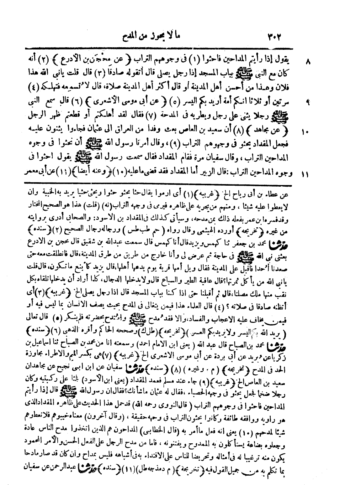 يقول إذا رأيتم المداحين فاحثوا (1) في وجوههم التراب (عن محجن بن الأدرع) (2) أنه كان مع النبي صلى الله عليه وسلم بباب المسجد إذا رجل يصلي قال اتقوله صادقا (3) قال قلت يا نبي الله هذا فلان وهذا من أحسن أهل المدينة أو قال أكثر أهل المدينة صلاة قال لا تسمعه فتهلكه (4) مرتين أو ثلاثا انكم امة أريد بكم اليسر (5) (عن أبي موسى الأشعري) (6) قال سمع النبي صلى الله عليه وسلم رجلا يثنى على رجل ويطريه في المدحة (7) فقال لقد أهلكتم أو قطعتم ظهر الرجل (عن مجاهد) (8) أن سعيد بن العاص بعث وفدا من العراق الى عثمان فجاءوا يثنون عليه فجعل المقداد يحثو في وجهوهم التراب (9) وقال أمرنا رسول الله صلى الله عليه وسلم أن نحثوا في وجوه المداحين التراب وقال سفيان مرة فقام المقداد فقال سمعت رسول الله صلى الله عليه وسلم يقول احثوا في وجوه المداحين التراب قال الزبير أما المقداد فقد قضى ما عليه (10) (وعنه أيضا) (11) عن أبي معمر