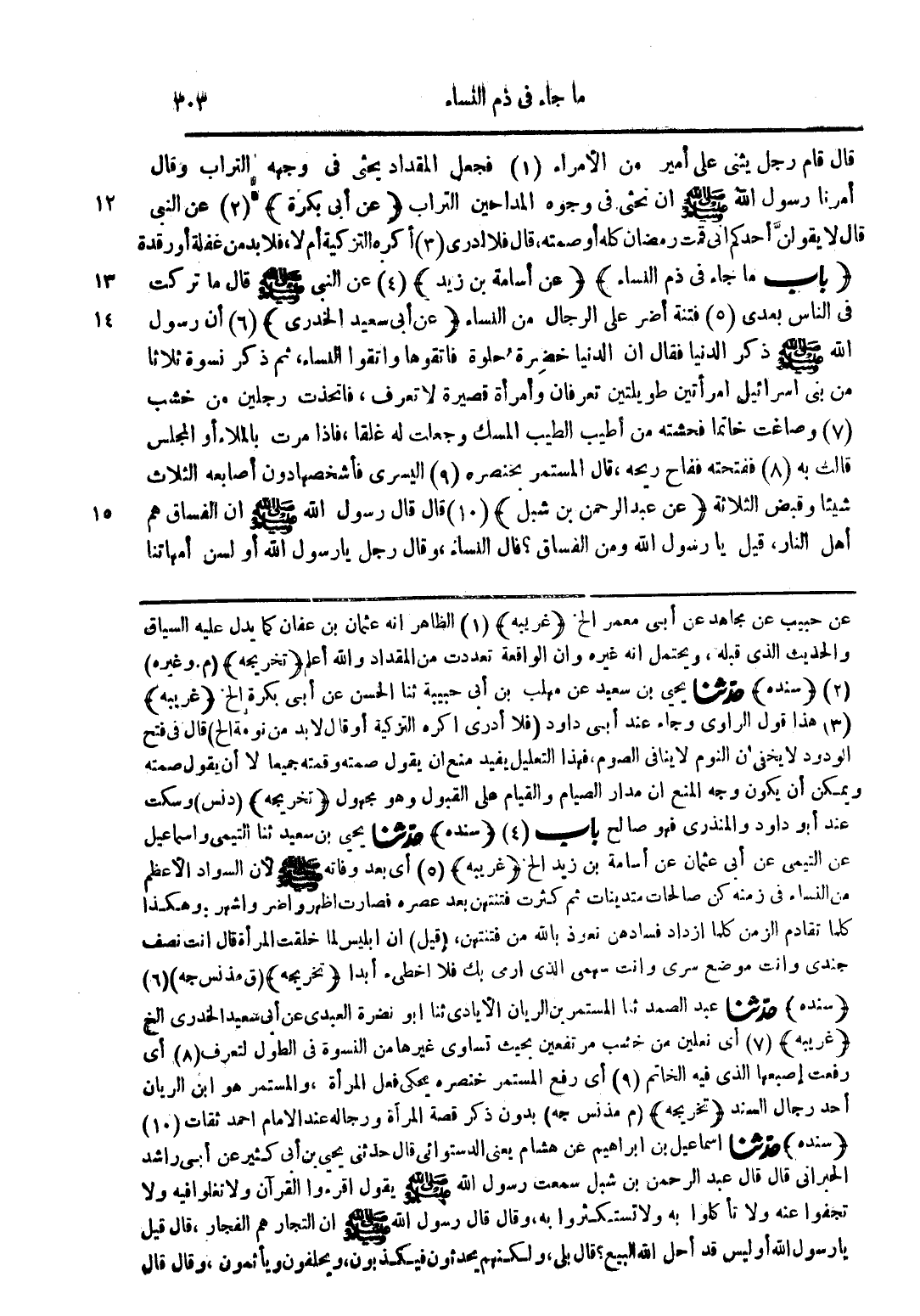 عن حبيب عن مجاهد عن أبي معمر الخ (غريبه) (1) الظاهر انه عثمان بن عفان كما يدل عليه السياق والحديث الذي قبله ويحتمل أنه غيره وان الواقعة تعددت من المقداد والله أعلم (تخريجه) (م وغيره) (2) (سنده) حدثنا يحيى بن سعيد عن مهلب بن أبي حبيبة ثنا الحسن عن ابي بكرة الخ (غريبه) (3) هذا قول الراوي وجاء عند أبي داود (فلا أدري اكره التزكية أو قال لا بد من نومة الخ) قال في فتح الودود لا يخفى أن النوم لا ينافي الصوم فهذا التعليل يفيد منع ان يقول صمته وقمته جميعا لا أن يقول صمته ويمكن ان يكون وجه المنع ان مدار الصيام والقيام على القبول وهو مجهول (تخريجه) (د نس) وسكت عند أبو داود والمنذري فهو صالح (باب) (4) (سنده) حدثنا يحيى بن سعيد ثنا التيمي واسماعيل عن التيمي عن أبي عثمان عن أسامة بن زيد الخ (غريبه) (5) أي بعد وفاته صلى الله عليه وسلم لأن السواد الأعظم من النساء في زمنه كن صالحات متدينات ثم كثرت فتنتهن بعد عصره فصارت اظهروا ضر واشهر وهكذا كلما تقادم الزمن كلما ازداد فسادهن نعوذ بالله من فتنتهن (قيل) ان ابليس لما خلقت المرأة قال انت نصف جندي وانت موضع سري وانت سهمي الذي ارمي بك فلا اخطئ ابدا (تخريجه) (ق مذ نس جه) (6) (سنده) حدثنا عبد الصمد ثنا المستمر بن الريان الأيادي ثنا ابو نضرة العبدي عن أبي سعيد الخدري الخ (غريبه) (7) أي نعلين من خشب مرتفعين بحيث تساوي غيرها من النسوة في الطول لتعرف (8) اي رفعت إصبعها الذي فيه الخاتم (9) أي رفع المستمر خنصره فيحكي المرأة والمستمر هو ابن الريان احد رجال السند (تخريجه) (م مذ نس جه) بدون ذكر قصة المرأة ورجاله عند الامام احمد ثقات (10) (سنده) حدثنا اسماعيل بن ابراهيم عن هشام يعني الدستوائي قال حدثني يحيى بن أبي كثير عن أبي راشد الحبراني قال قال عبد الرحمن بن شبل سمعت رسول الله صلى الله عليه وسلم يقول اقرءوا القرآن ولا تغلوا فيه ولا تجفوا عنه ولا تأكلوا به ولا تستكثروا به وقال قال رسول الله صلى الله عليه وسلم ان التجار هم الفجار قال قيل يا رسول الله أو ليس قد أحل الله البيع؟ قال بلى ولكنهم يحدثون فيكذبون ويحلفون ويأثمون وقال قال