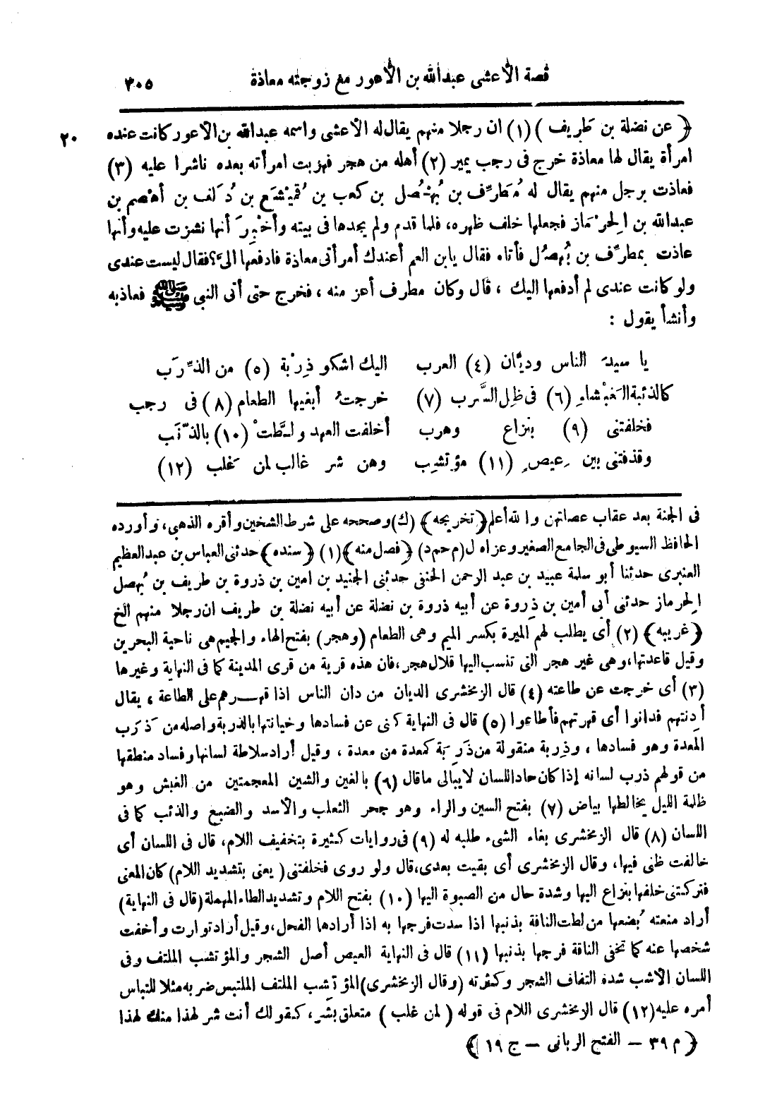 (عن نضلة بن طريف) (1) أن رجلا منهم يقال له الأعشى واسمه عبد الله بن الأعور كانت عنده امرأة يقال لها معاذة خرج في رجب يمير (2) أهله من هجر فهربت امرأته بعده ناشرا عليه (3) فعاذت برجل منهم يقال له مطرف بن بهصل بن كعب بن قميشع بن دلف بن أهصم بن عبد الله بن الحرماز فجعلها خلف ظهره فلما قدم ولم يجدها في بيته وأخبر انها نشزت عليه وانها عادت بمطرف بن بهصل فأتاه فقال يا ابن العم أعندك امرأتي معاذة فادفعها إلى؟ فقال ليست عندي ولو كانت عندي لم أدفعها اليك قال وكان مطرف أعز منه فخرج حتى أتى النبي صلى الله عليه وسلم فعاذبه وأنشأ يقول:
