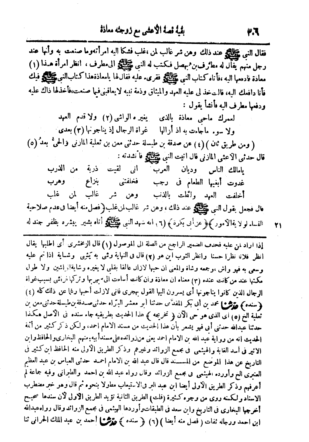 إذا أراد لمن عليه فحذف الضمير الراجع من الضلة الى الموصول (1) قال الزمخشري أي اطلبها يقال انظر فلانا نظرا حسنا وانظر الثوب اين هو (2) قال في النهاية وشي به يشي وشاية اذا نم عليه وسعى به فهو واش وجمعه وشاة والمعنى ان حبها لا زال عالقا بقلبي لا يغيره وشاية الواشين ولا طول مكثها عند من كانت عند (3) معناه أن معاذة وان كانت اساءت الي بهربها وتركها فراشي بسبب غواة الرجال الذين كانوا يناجونها أي يسرون اليها القول بهجري فإني لا زلت أحبها رغما عن ذلك كله (4) (سنده) حدثنا محمد بن أبي بكر المقدمي حدثنا ابو معشر البراه حدثن صدقة بن طيلة حدثني معن بن ثعلبة الخ (5) أي الذي هو حي الآن (تخريجه) هذا الحديث بطريقيه جاء سنده في الأصل هكذا حدثنا عبد الله حدثني أبي فهو يشعر بأن هذا الحديث من مسند الامام احمد ولكن ذكر كثير من أئمة الحديث أنه من رواية عبد الله بن الامام احمد يعني من زوائده على مسند أبيه منهم البخاري والحافظ وابن الاثير في أسد الغابة والهيثمي في مجمع الزوائد وغيرهم وذكر الطريق الأولى منه الحافظ ابن الكثير في التاريخ عن هذا الموضع من المسند قال قال عبد الله بن الامام احمد حدثني العباس بن عبد العظيم العنبري الخ وأورده الهيثمي في مجمع الزوائد وقال رواه عبد الله بن احمد والطبراني وفيه جماعة لم أعرفهم وذكر الطريق الأولى ايضا ابن عبد البر في الاستيعاب مطولا بنحوه ثم قال وهو خبر مضطرب الاسناد ولكنه روى من وجوه كثيرة (قلت) الطريق الثانية تؤيد الطريق الأولى لأن سندها صحيح أخرجها البخاري في التاريخ وابن سعد في الطبقات وأوردها الهيثمي في مجمع الزوائد وقال رواه عبد الله ابن احمد ورجاله ثقات (فصل منه أيضا) (6) (سنده) حدثنا أحمد بن عبد الملك الحراني ثنا