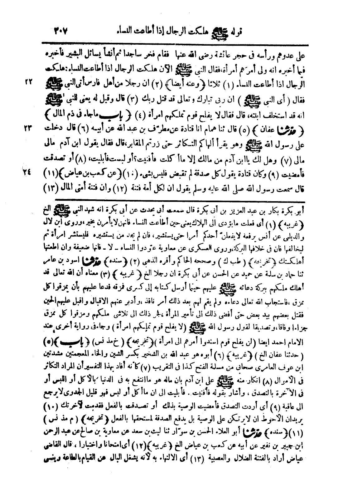 أبو بكرة بكار بن عبد العزيز بن أبي بكرة قال سمعت أبي يحدث عن أبي بكرة انه شهد النبي صلى الله عليه وسلم الخ (غريبه) (1) أي فعلت ما يؤدي إلى الهلاك يعني حين أطاعت النساء فإنهن لا يأمرن بخير وروى ابن لال والديلمي عن أنس يرفعه لا يفعلن أحدكم أمرا حتى يستشير فإن لم يجد من يستشيره فليستشر امرأة ثم ليخالفها فإن خلافها البركة وروى العسكري عن معاوية عودوا النساء _لا_ فإنها ضعيفة وان اطعتها اهلكتك (تخريجه) (طب ك) وصححه الحاكم وأقره الذهبي (2) (سنده) حدثنا اسود بن عامر ثنا حماد بن سلمة عن حميد عن الحسن عن أبي بكرة ان رجلا الخ (غريبه) (3) معناه أن الله تعالى قد أهلك ملكهم ببركة دعائه صلى الله عليه وسلم عليهم حينما ارسل كتابه الى كسرى فمزقه فدعا عليهم بأن يمزقوا كل ممزق فاستجاب الله تعالى دعاءه ولم يقم لهم بعد ذلك أمر نافذ وأدبر عنهم الاقبال واقبل عليهم الحين فقتل بعضهم بيد بعض حتى أفضى ذلك إلى تأمير المرأة فجر ذلك إلى تلاشي ملكهم ومؤقوا كل ممزق جزاءا وفاقا وتصديقا لقول رسول الله صلى الله عليه وسلم (لا يفلح قوم تملكهم امرأة) وجاء في رواية اخرى عند الامام احمد ايضا (لن يفلح قوم اسندوا أمرهم إلى امرأة) (تخريجه) (خ مذ نس) (باب) (5) (حدثنا عفان الخ) (غريبه) (6) أبوه هو عبد الله بن الشخير بكسر الشين والخاء المعجمتين مشدتين ابن عوف العامري صحابي من مسلمة الفتح كذا في التقريب (7) كأنه أفاد بهذا التفسير أن المراد التكاثر في الأموال (8) انكار منه صلى الله عليه وسلم على ابن آدم بأن ماله هو ما انتفع به في الدنيا بالأكل أو اللبس أو الآخرة بالتصدق وأشار بقوله فأفنيت فأبليت الى ان ما اكل أو لبس فهو قليل الجدوى لا يرجع الى عاقبة (9) أي أردت التصدق فأمضيت الوصية بذلك أو تصدقت بالفعل فقمت لآخرتك (10) يريد ان الأحوط ان لا يرتكن على الوصية بل يدفع الصدقة لمستحقها بالفعل (تخريجه) (م مذ نس) (11) (سنده) حدثنا ابو العلاء الحسن بن سوار ثنا ليث بن سعد عن معاوية بن صالح عن عبد الرحمن ابن جبير بن نفير عن أبيه عن كعب بن عياض الخ (غريبه) (12) اي امتحانا واختبارا قال القاضي عياض أراد بالفتنة الضلال والمعصية (13) أي الالتهاء به لأنه يشغل البال عن القيام بالطاعة وينسى
