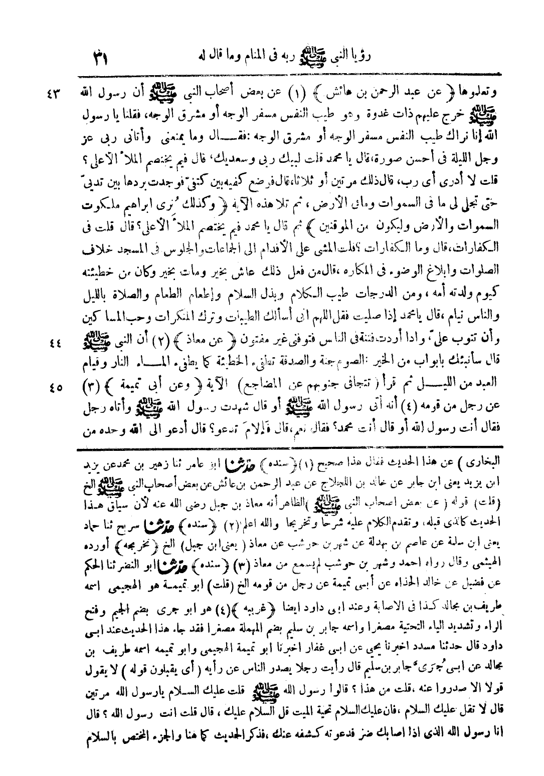 وتعلموها (عن عبد الرحمن بن عائش) (1) عن بعض أصحاب النبي صلى الله عليه وسلم أن رسول الله صلى الله عليه وسلم خرج عليهم ذات غذوة وهو طيب النفس مسفر الوجه أو مشرق الوجه فقلنا يا رسول الله إنا نراك طيب النفس مسفر الوجه أو مشرق الوجه فقال وما يمنعني وأتاني ربي عز وجل الليلة في أحسن صورة قال يا محمد قلت لبيك ربي وسعديك قال فيم يختصم الملأ الأعلى؟ قلت لا أدري أي رب قال ذلك مرتين أو ثلاثا قال فوضع كفيه بين كتفي فوجدت برها بين ثديي حتى تجلى لي ما في السمواقت وما في الأرض ثم تلا هذه الآية (وكذلك نري إبراهيم ملكوت السموات والأرض وليكون من الموقنين) ثم قال يا محمد فيم يختصم الملأ الأعلى؟ قال قلت في الكفارات قال وما الكفارات؟ قلت المشي على الأقدام إلى الجماعات والجلوس في المسجد خلاف الصلوات وابلاغ الوضوء في المكاره قال من فعل ذلك عاش بخير ومات بخير وكان من خطيئته كيوم ولدته أمه ومن الدرجات طيب الكلام وبذل السلام وإطعام الطعام والصلاة بالليل والناس نيام قال يا محمد إذا صليت فقل اللهم إني اسألك الطيبات وترك المنكرات وحب المساكين وأن تتوب علي وإذا أردت فتنة في الناس فتوفني غير مفتون (عن معاذ) (2) أن النبي صلى الله عليه وسلم قال سأنبئك بأبواب من الخير الصوم جنة والصدقة تطفئ الخطيئة كما يطفئ الماء النار وقيام العبد من الليل ثم قرأ (تتجافى جنوبهم عن المضاجع) الآية (وعن أبي تميمة) (3) عن رجل من قومه (4) أنه أتى رسول الله صلى الله عليه وسلم أو قال شهدت رسول الله صلى الله عليه وسلم وأتاه رجل فقال أنت رسول الله أو قال أنت محمد؟ فقال نعم قال فإلام تدعو؟ قال أدعو إلى عبادة الله وحده من