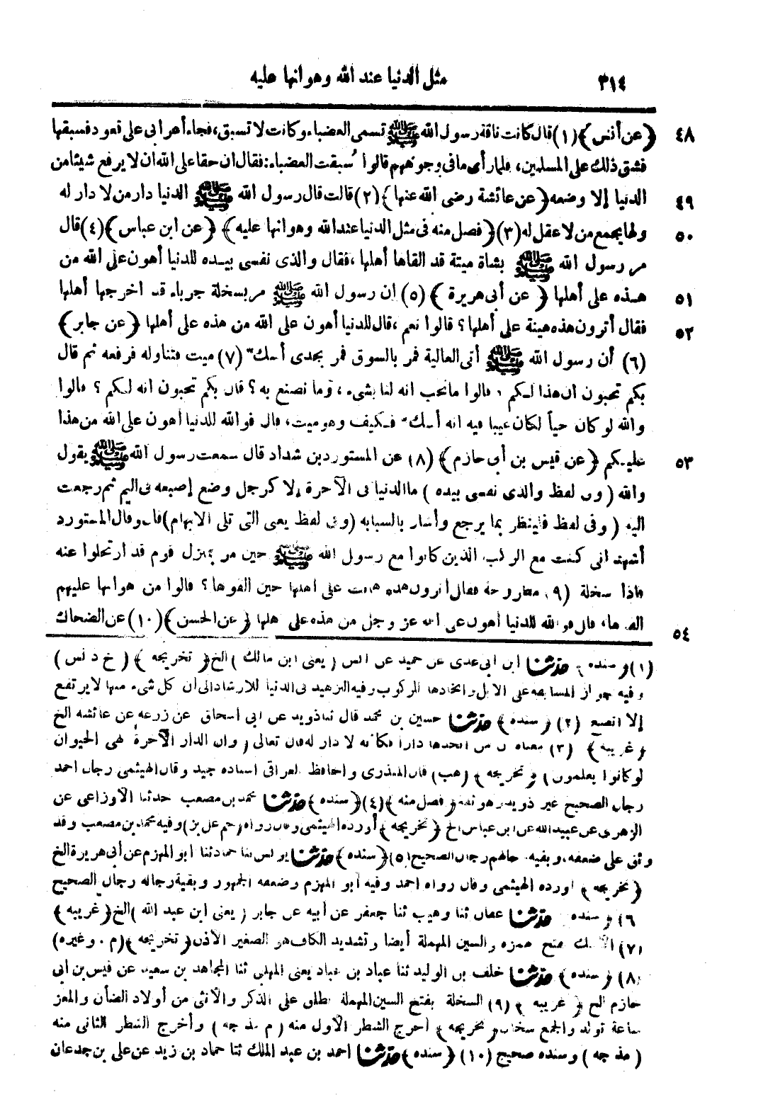 (1) (سنده) حدثنا ابن أبي عدي عن حميد عن أنس (يعني ابن مالك) الخ (تخريجه) (خ ذ نس) وفيه جواز المسابقة على الابل واتخاذها الركوب وفيه التزهيد في الدنيا للارشاد إلى ان كل شيء منها لا يرتفع إلا انصع (2) (سنده) حدثنا حسين بن محمد قال ثنا ذويد عن أبي اسحاق عن زرعة عن عائشه الخ (غريبه) (3) معناه أن من اتخذها دارا فكأنه لا دار له قال تعالى (وان الدار الآخرة لهي الحيوان لو كانوا يعلمون) (تخريجه) (هب) قال المنذري والحافظ العراقي اسناده جيد وقال الهيثمي رجال احمد رجال الصحيح غير ذويد وهو ثقة (فصل منه) (4) (سنده) حدثنا محمد بن مصعب حدثنا الأوزاعي عن الزهري عن عبيد الله عن ابن عباس الخ (تخريجه) أورده الهيثمي وقال رواه (حم عل بز) وفيه محمد بن مصعب وقد وثق على ضعفه وبقية رجالهم رجال الصحيح (5) (سنده) حدثنا يونس ثنا حماد ثنا ابو المهزم عن أبي هريرة الخ (تخريجه) أورده الهيثمي وقال رواه احمد وفيه ابو المهزم وضعفه الجمهور وبقية رجاله رجال الصحيح (6) (سنده) حدثنا عفان ثنا وهيب ثنا جعفر عن أبيه عن جابر (يعني ابن عبد الله) الخ (غريبه) (7) الأسك فتح الهمزة والسين المهملة أيضا وتشديد الكاف هو الصغير الأذن (تخريجه) (م وغيره) (8) (سنده) حدثنا خلف بن الوليد ثنا عباد بن عباد يعني المهلبي ثنا المجاهد بن سعيد عن قيس بن ابي حازم الخ (غريبه) (9) السخلة بفتح السين المهملة يطلق على الذكر والأنثى من أولاد الضأن والمعز ساعة تولد والجمع سخال (تخريجه) اخرج الشطر الاول منه (م مذ جه) واخرج الشطر الثاني منه (مذ جه) وسنده صحيح (10) (سنده) حدثنا احمد بن عبد الملك ثنا حماد بن زيد عن علي بن جدعان