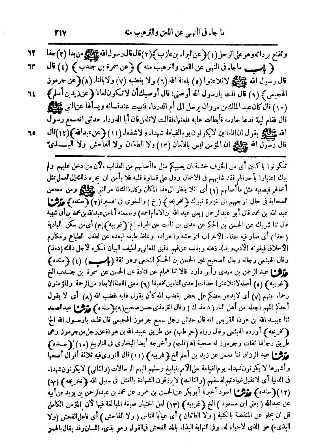 وتقنع بردائه وهو على الرحل (1) (عن البراء بن عازب) (2) قال قال رسول الله صلى الله عليه وسلم من بدا (3) جفا (باب ما جاء في النهي عن اللعن والترهيب منه) (عن سمرة بن جندب) (4) قال قال رسول الله صلى الله عليه وسلم لا تلاعنوا (5) بلعنة الله (6) ولا بغضبه (7) ولا بالنار (8) (عن جرموز الهجيمي) (9) قال قلت يا رسول الله أوصني قال أوصيك أن لا تكون لعانا (عن أبي زيد بن أسلم) (10) قال كان عبد الملك بن مروان يرسل إلى أم الدرداء فتبيت عند نسائه ويسألها عن النبي صلى الله عليه وسلم قال فقام ليلة فدعا خادمه فأبطأت عليه فلعنها فقالت لا تلعن فإن أبا الدرداء حدثني انه سمع رسول الله صلى الله عليه وسلم يقول ان اللعانين لا يكونون يوم القيامة شهداء ولا شفعاء (11) (عن عبد الله) (12) قال قال رسول الله صلى الله عليه وسلم ان المؤمن ليس باللعان (13) ولا الطعان ولا الفاحش ولا البذيء