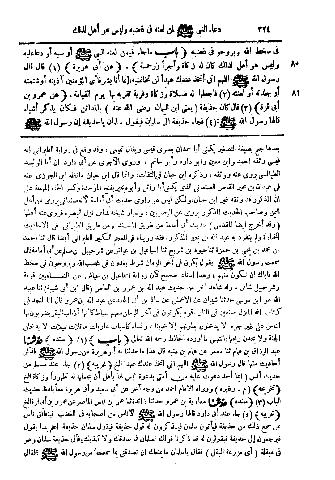 في سخط الله ويروحو في غضبه (باب ما جاء فيمن لعنه النبي صلى الله عليه وسلم أو سبه أو دعا عليه وليس هو أهل لذلك كان له زكاة وأجرا ورحمة) (عن أبي هريرة) (1) قال قال رسول الله صلى الله عليه وسلم اللهم اني اتخذ عندك عهدا لن تخلفنيه إنما انا بشر فإي المؤمنين آذيته أو شتمته أو جلدته أو لعنته (2) فاجعلها له صلاة وزكاة وقربة تقربه بها يوم القيامة (عن عمرو بن أبي قرة) (3) قال كان حذيفة (يعني ابن اليمان رضي الله عنه) بالمدائن فكان يذكر أشياء قالها رسول الله صلى الله عليه وسلم (4) فجاء حذيفة الى سلمان فيقول سلمان يا حذيفة إن رسول الله صلى الله عليه وسلم