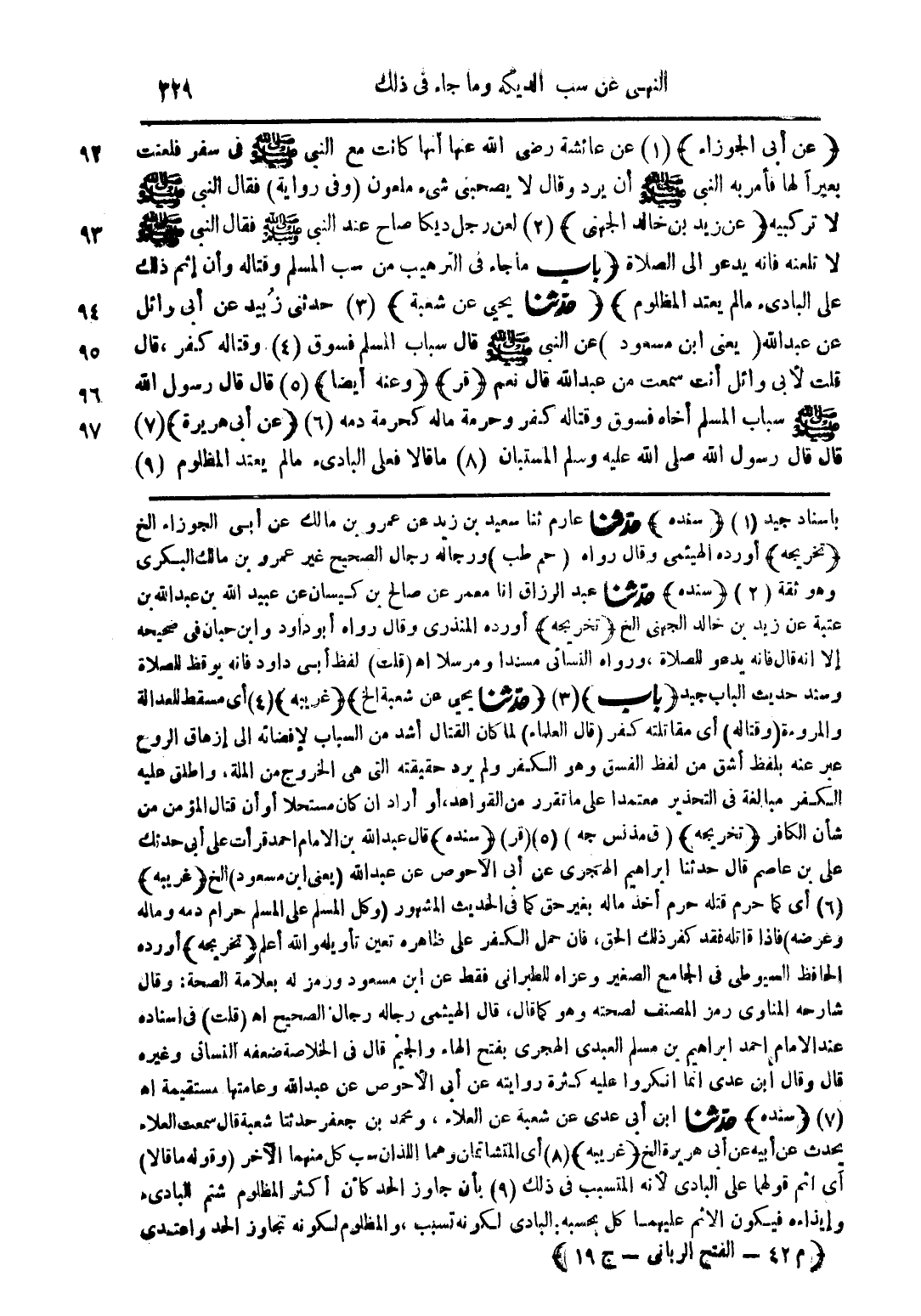 بإسناد جيد (1) (سنده) حدثنا عارم ثنا سعيد بن زيد عن عمرو بن مالك عن أبي الجوزاء الخ (تخريجه) أورده الهيثمي وقال رواه (حم طب) ورجاله رجال الصحيح غير عمرو بن مالك البكري وهو ثقة (2) (سنده) حدثنا عبد الرزاق انا معمر عن صالح بن كيسان عن عبيد الله بن عبد الله بن عتبة عن زيد بن خالد الجهني الخ (تخريجه) أورده المنذري وقال رواه أبو داود وابن حبان في صحيحه إلا انه قال فإنه يدعو للصلاة ورواه النسائي مسندا ومرسلا اهـ (قلت) لفظ ابى داود فإنه يوقظ للصلاة وسند حديث الباب جيد (باب) (3) (حدثنا يحيى عن شعبة الخ) (غريبه) (4) أي مسقط للعدالة والمروة (وقتاله) أي مقاتله كفر (قال العلماء) لما كان القتال اشد من السباب لافضائه الى ازهاق الروح عبر عنه بلفظ اشق من لفظ الفسق وهو الكفر ولم يرد حقيقته التي هي الخروج من المة واطلق عليه الكفر مبالغة في التحذير معتمدا على ما تقرر من القواعد أو أراد ان كان مستحلا أو ان قتال المؤمن من شأن الكافر (تخريجه) (ق مذ نس جه) (5) (قر) (سنده) قال عبد الله بن الامام احمد قرأت على ابي حدثك علي بن عاصم قال حدثنا ابراهيم الهجري عن أبي الاحوص عن عبد الله (يعني ابن مسعود) الخ (غريبه) (6) أي كما حرم قتله حرم أخذ ماله بغير حق كما في الحديث المشهور (وكل المسلم على المسلم حرام دمه وماله وعرضه) فإذا قاتله فقد كفر ذلك الحق فإن حمل الكفر على ظاهره تعين تأويله والله اعلم (تخريجه) أورده الحافظ السيوطي في الجامع الصغير وعزاه للطبراني فقط عن ابن مسعود ورمز له بعلامة الصحة وقال شارحه المناوي رمز المصنف لصحته وهو كما قال قال الهيثمي رجاله رجال الصحيح اهـ (قلت) في اسناده عند الامام احمد ابراهيم بن مسلم العبدي الهجري بفتح الهاء والجيم قال في الخلاصة ضعفه النسائي وغيره قال وقال ابن عدي انما انكروا عليه كثرة روايته عن أبي الاحوص عن عبد الله وعامتها مستقيمة اهـ (7) (سنده) حدثنا ابن ابي عدي عن شعبة عن العلاء ومحمد بن جعفر حدثنا شعبة قال سمعت العلاء يحدث عن أبيه عن أبي هريرة الخ (غريبه) (8) اي المتشاتمان وهما اللذان سب كل منهما الآخر (وقوله ما قالا) أي اثم قولهما على البادي لأنه المتسبب في ذلك (9) بأن جاوز الحد كأن اكثر المظلوم شتم البادئ وايذاءه فيكون الاثم عليهما كل بحسبه البادي لكونه تسبب والمظلوم لكونه تجاوز الحد واعتدى