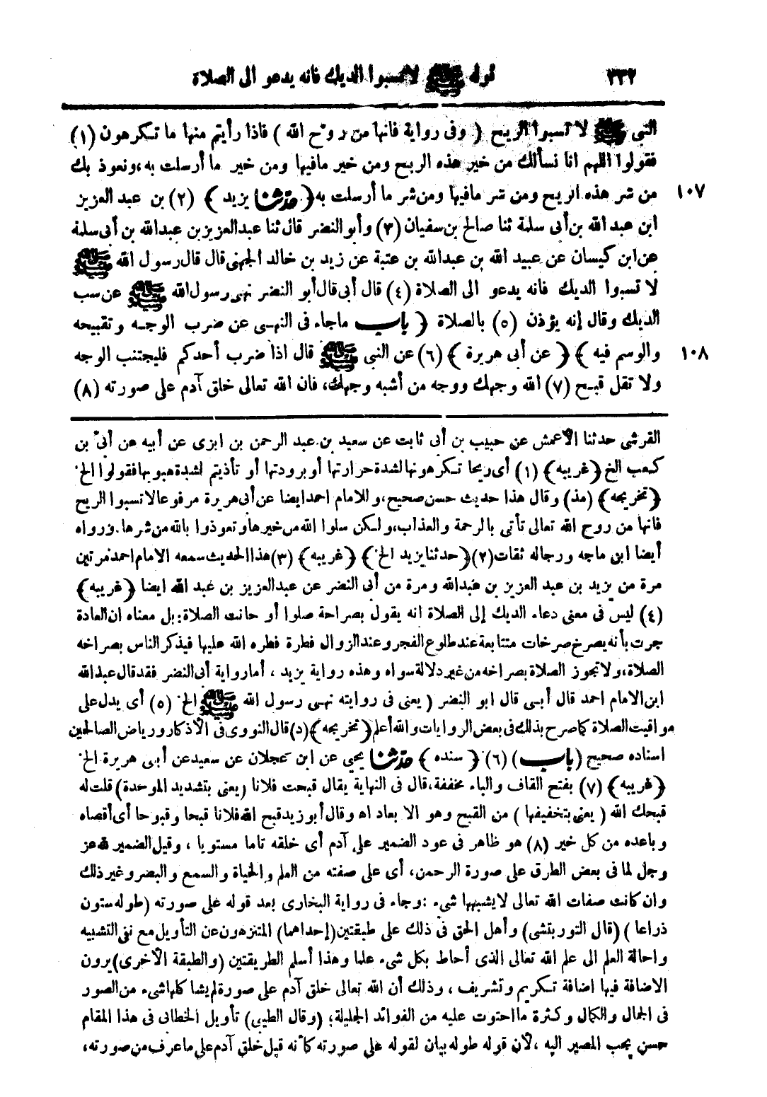 القرشي حدثنا الاعمش عن حبيب بن أبي ثابت عن سعيد بن عبد الرحمن بن ابزي عن أبيه عن أبي بن كعب الخ (غريبه) (1) أي ريحا تكرهونها لشدة حرارتها أو برودتها أو تأذيتم لشدة هبوبها فقولوا الخ (تخريجه) (مذ) وقال هذا حديث حسن صحيح وللامام احمد ايضا عن ابي هريرة مرفوعا لا تسبوا الريح فإنها من روح الله تعالى تأتي بالرحمة والعذاب ولكن سلوا الله من خيرها وتعوذوا بالله من شرها ورواه أيضا ابن ماجه ورجاله ثقات (2) (حدثنا يزيد الخ) (غريبه) (3) هذا الحديث سمعه الامام احمد مرتين مرة من يزيد بن عبد العزيز بن عبد الله ومرة من أبي النضر عن عبد العزيز بن عبد الله ايضا (غريبه) (4) ليس في معنى دعاء الديك الى الصلاة انه يقول بصراحة صلوا أو حانت الصلاة بل معناه ان العادة جرت بأنه يصرخ صرخات متتابعة عند طلوع الفجر وعند الزوال فطرة فطره الله عليها فيذكر الناس بصراخه الصلاة ولا تجوز الصلاة بصراخه من غير دلالة سواء وهذه رواية يزيد أما رواية أبي النضر فقد قال عبد الله ابن الامام احمد قال ابي قال ابو النضر (يعني في روايته نهى رسول الله صلى الله عليه وسلم الخ) (5) أي يدل على مواقيت الصلاة كما صرح بذلك في بعض الروايات والله أعلم (تخريجه) (د) قال النووي في الاذكار ورياض الصالحين اسناده صحيح (باب) (6) (سنده) حدثنا يحيى عن ابن عجلان عن سعيد عن أبي هريرة الخ (غريبه) (7) بفتح القاف والياء مخففة قال في النهاية يقال قبحت فلانا (يعني بتشديد الموحدة) قلت له قبحك الله (يعني بتخفيفها) من القبح وهو الابعاد اهـ وقال أبو زيد قبح الله فلانا قبحا وقبوحا أي اقصاه وباعده من كل خير (8) هو ظاهر في عود الضمير على آدم أي خلقه تاما مستويا وقيل الضمير لله عز وجل لما في بعض الطرق على صورة الرحمن أي على صفته من العلم والحياة والسمع والبصر وغير ذلك وان كانت صفات الله تعالى لا يشبهها شيء وجاء في رواية البخاري بعد قوله على صورته (طوله ستون ذراعا) (قال التوربتشي) وأهل الحق في ذلك على طبقتين (احداهما) المتنزهون عن التأويل مع نفي التشبيه واحالة العلم الى علم الله تعالى الذي احاط بكل شيء علما وهذا اسلم الطريقتين (والطبقة الأخرى) يرون الاضافة فيها اضافة تكريم وتشريف وذلك ان الله تعالى خلق آدم على صورة لم يشاكلها شيء من الصور في الجمال والكمال وكثرة ما احتوت عليه من الفوائد الجليلة (وقال الطيبي) تأويل الخطابي في هذا المقام حسن يجب المصير اليه لأن قوله طوله بيان لقوله على صورته كأنه قيل خلق آدم على ما عرف من صورته