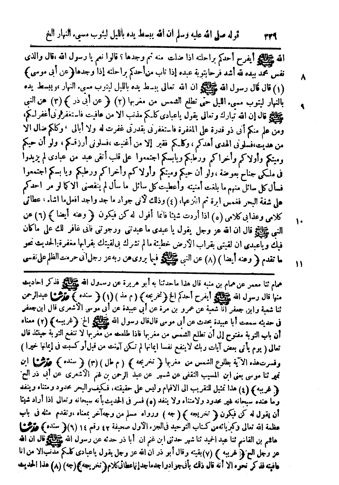همام ثنا معمر عن همام بن منبه قال هذا ما حدثنا به أبو هريرة عن رسول الله صلى الله عليه وسلم فذكر احاديث منها قال رسول الله صلى الله عليه وسلم ايفرح احدكم الخ (تخريجه) (م مذ) (1) (سنده) حدثنا عبد الرحمن ثنا شعبة وابن جعفر انا شعبة عن عمرو بن مرة عن أبي عبيدة عن أبي موسى الاشعري قال ابن جعفر في حديثه سمعت ابا عبيدة يحدث عن أبي موسى قال قال رسول الله صلى الله عليه وسلم الخ (غريبه) (2) معناه ان باب التوبة مفتوح الى ان تطلع الشمس من مغربها لا تنفع التوبة حينئذ قال تعالى (يوم يأتي بعض آيات ربك لا ينفع نفسا ايمانها لم تكن آمنت من قبل أو كسبت في ايمانها خيرا) وفسرت في هذه الآية بطلوع الشمس من مغربها (تخريجه) (م طل) (3) (سنده) حدثنا ابن نمير ثنا موسى يعني ابن المسيب الثقفي عن شهر عن عبد الرحمن بن غنم الاشعري عن أبي ذر الخ (غريبه) (4) هذا تمثيل للتقريب إلى الافهام وليس على حقيقته فكيف والبحر محدود ومتناه وينفد وما عنده سبحانه غير محدود ولا متناه ولا ينفد (5) فسر في الحديث بأنه سبحانه وتعالى اذا اراد شيئا أن يقول له كن فيكون (تخريجه) (جه) ورواه مسلم من وجه آخر بمعناه وتقدم مثله في باب عظمة الله تعالى وكبريائه من كتاب التوحيد في الجزء الاول صحيفة 42 رقم 14 (6) (سنده) حدثنا هاشم بن القاسم ثنا عبد الحميد ثنا شهر حدثني ابن غنم ان ابا ذر حدثه عن رسول الله صلى الله عليه وسلم قال ان الله عز وجل الخ (غريبه) (7) بقيته وقال ابو ذر ان الله عز وجل يقول يا عبادي كلكم مذنب الا من انا عافيته فكذر نحوه الا انه قال ذلك بأني جواد واجد ماجد إنما عطائي كلام (تخريجه) (جه) (8) هذا الحديث