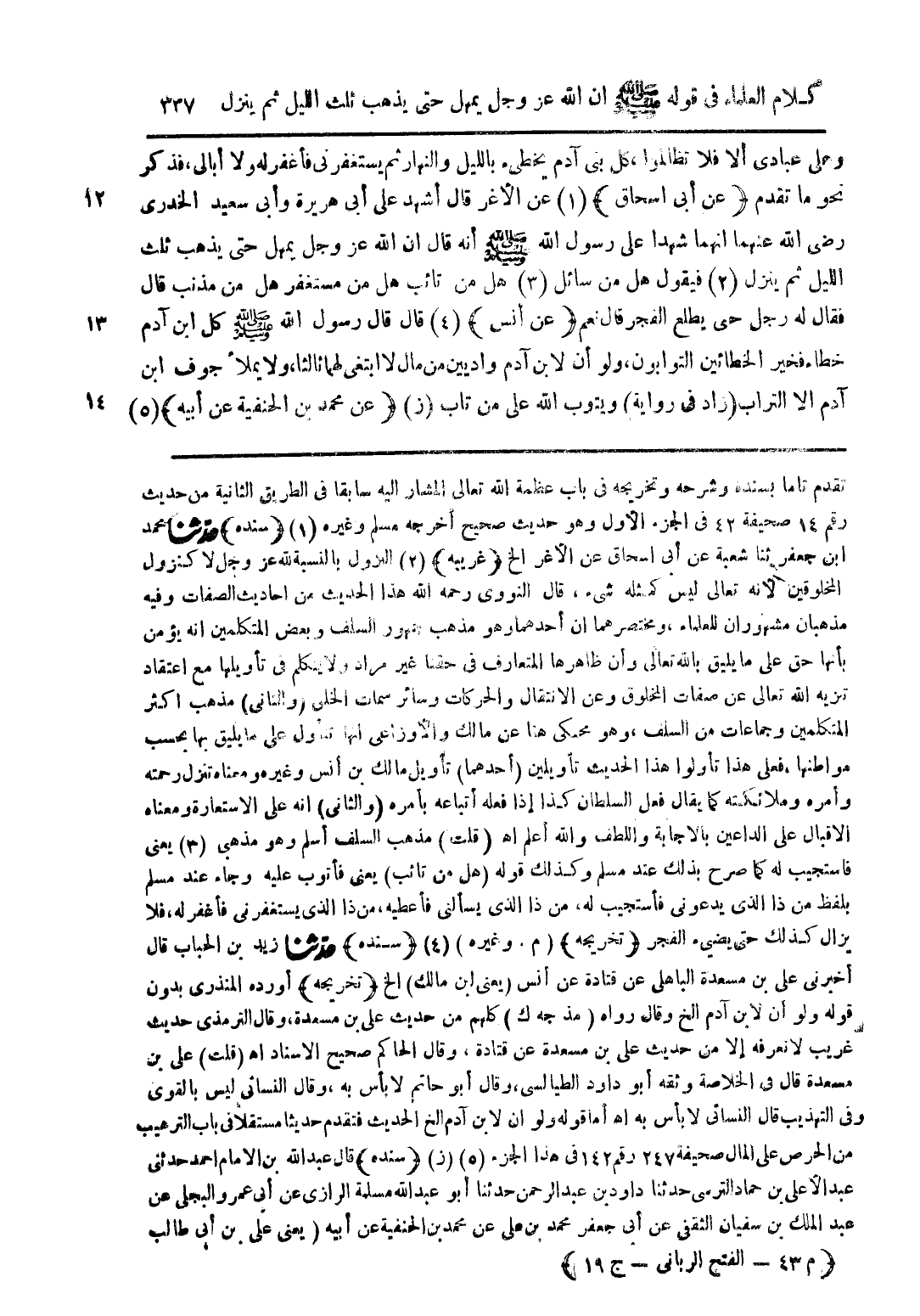 وعلى عبادي ألا فلا تظالموا كل بني آدم يخطئ بالليل والنهار ثم يستغفرني فأغفر له ولا أبالي فذكر نحو ما تقدم (عن أبي اسحاق) (1) عن الأغر قال أشهد على أبي هريرة وأبي سعيد الخدري رضي الله عنهما انهما شهدا على رسول الله صلى الله عليه وسلم أنه قال ان الله عز وجل يمهل حتى يذهب ثلث الليل ثم ينزل (2) فيقول هل من سائل (3) هل من تائب هل من مستغفر هل من مذنب قال فقال له رجل حتى يطلع الفجر قال نعم (عن أنس) (4) قال قال رسول الله صلى الله عليه وسلم كل ابن آدم خطاء فخير الخطائين التوابون ولو ان لابن آدم واديين من مال لا ابتغى لهما ثالثا ولا يملأ جوف ابن آدم الا التراب (زاد في رواية) ويتوب الله على من تاب (ز) (عن محمد بن الحنيفة عن أبيه) (5)
