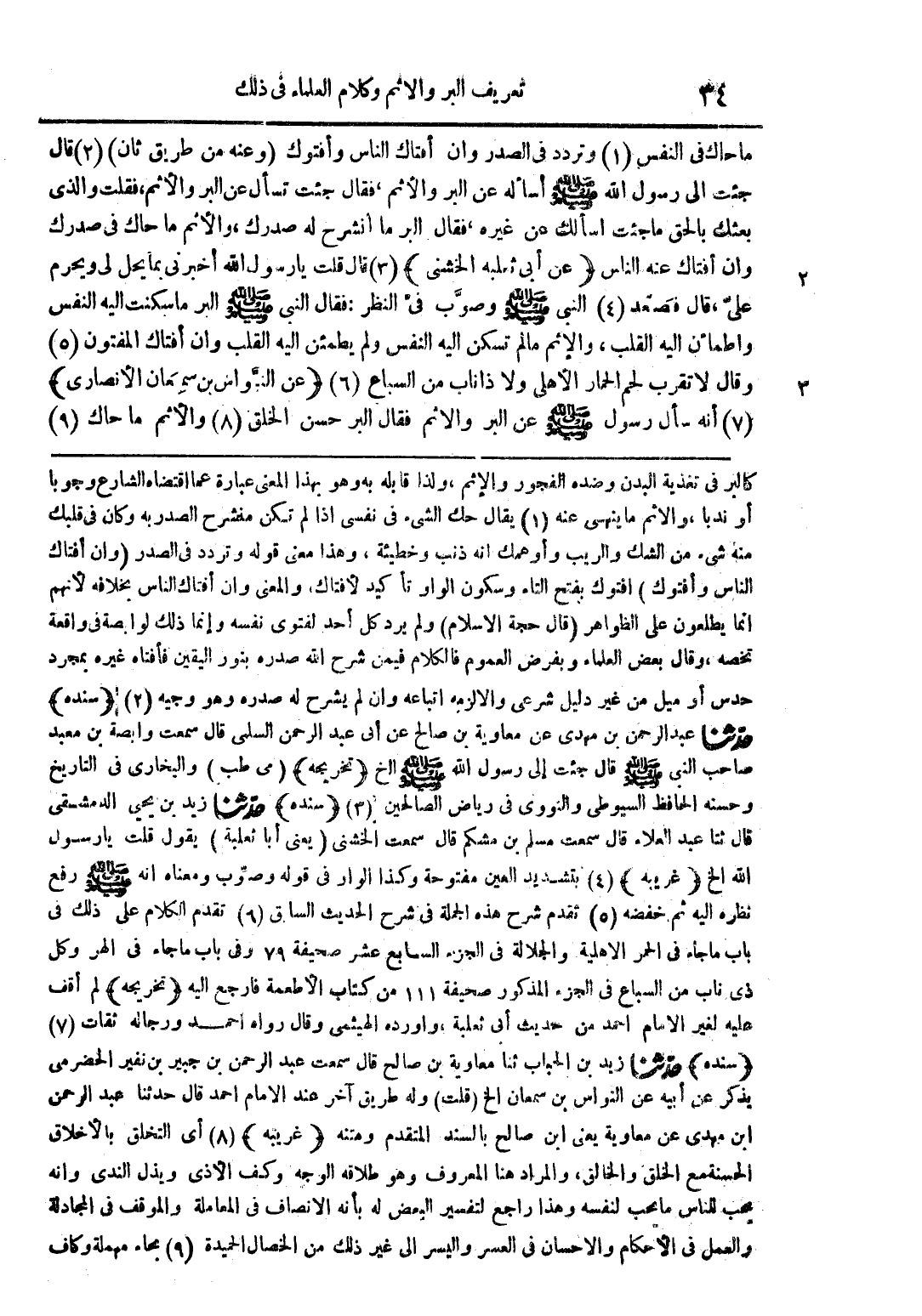 كالبر في تغذية البدن وضده الفجور والإثم ولذا قابله به وهو بهذا المعني عبارة عما اقتضاه الشارع وجوبا أو ندبا والإثم ما ينهي عنه (1) يقال حك الشيء في نفسي إذا لم تكن منشرح الصدر به وكان في قلبك منه شيء من الشك والريب وأوهمك أنه ذنب وخطيئة وهذا معنى قوله وتردد والصدر (وإن افتاك الناس وافتوك) افتوك بفتح التاء وسكون الواو تأكيد لأفتاك والمعنى وإن افتاك الناس بخلافه لأنهم إنما يطلعون على الظواهر (قال حجة الإسلام) ولم يرد كل أحد لفتوى نفسه وإنما ذلك لوابصة في واقعة تخصه وقال بعض العلماء وبفرض العموم فالكلام فيمن شرح الله صدره بنور اليقين فأفتاه غيره بمجرد حدس أو ميل من غير دليل شرعي والا لزمه اتباعه وان لم يشرح له صدره وهو وجيه (2) (سنده) حدثنا عبد الرحمن بن مهدي عن معاوية بن صالح عن أبي عبد الرحمن السلمي قال سمعت وابصة بن معبد صاحب النبي صلى الله عليه وسلم قال جئت إلى رسول الله صلى الله عليه وسلم الخ (تخريجه) (مي طب) والبخاري في التاريخ وحسنه الحافظ السيوطي والنووي في رياض الصالحين (3) (سنده) حدثنا زيد بن يحيى الدمشقي قال ثنا عبد العلاء قال سمعت مسلم بن مشكم قال سمعت الخشني (يعني أبا ثعلبة) يقول قلت يا رسول الله الخ (غريبه) (4) بتشديد العين مفتوحة وكذا الواو في قوله وصوب ومعناه أنه صلى الله عليه وسلم رفع نظره إليه ثم خفضه (5) تقدم شرح هذه الجملة في شرح الحديث السابق (6) تقدم الكلام على ذلك في باب ما جاء في الحمر الأهلية والجلالة في الجزء السابع عشر صحيفة 79 وفي باب ما جاء في الهر وكل ذي ناب من السباع في الجزء المذكور صحيفة 111 من كتاب الأطعمة فارجع إليه (تخريجه) لم عليه إلا لغير الإمام أحمد من حديث أبي ثعلبة وأورده الهيثمي وقال رواه أحمد ورجاله ثقات (7) (سنده) حدثنا زيد بن الحباب ثنا معاوية بن صالح قال سمعت عبد الرحمن بن جبير بن نفير الحضرمي يذكر عن أبيه عن النواس بن سمعان الخ (قلت) وله طريق آخر عند الإمام أحمد قال حدثنا عبد الرحمن ابن مهدي عن معاوية يعني ابن صالح بالسند المتقدم ومتنه (غريبه) (8) أي التخلق بالأخلاق الحسنة مع الخلق والخالق والمراد هنا المعروف وهو طلاقة الوجه وكف الأذى وبذل الندى وأنه يحب للناس ما يحب لنفسه وهذا راجع لتفسير البعض له بأنه الانصاف في المعاملة والموقف في المجادلة والعمل في الأحكام والاحسان في العسر واليسر إلى غير ذلك من الخصال الحميدة (9) بحاء مهملة وكاف