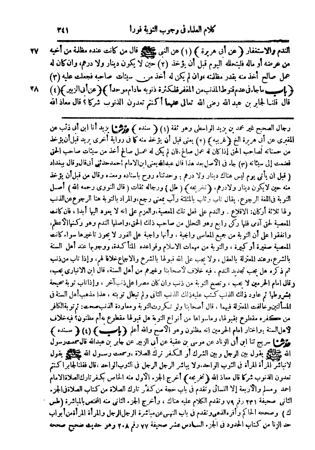 رجال الصحيح غير محمد بن يزيد الواسطي وهو ثقة (1) (سنده) حدثنا يزيد انا ابن ابي ذئب عن المقبري عن ابي هريرة الخ (غريبه) (2) يعني قبل أن يؤخذ منه كما في رواية اخرى يريد قبل ان يؤخذ من حسناته لصاحب الحق اذا كان له عمل صالح فإن لم يكن له عمل صالح أخذ من سيئات صاحب الحق فضمت الى سيئاته (3) جاء في الاصل بعد هذا قال عبد الله يعني ابن الامام احمد حدثني ابي قال وقال ببغداد (قبل أن يأتي يوم ليس هناك دينار ولا درهم وحدثناه روح باسناده ومعناه وقال من قبل ان يؤخذ منه حين لا يكون دينار ولا درهم) (تخريجه) (طل) ورجاله ثقات (قال النووي رحمه الله) أصل التوبة في اللغة الرجوع يقال تاب وثاب بالمثلثة وآب بمعنى رجع والمراد بالتوبة هنا الرجوع عن الذنب ولها ثلاثة أركان الاقلاع والندم على فعل تلك المعصية والعزم على انه لا يعود اليها ابدا فإن كانت المعصية لحق آدمي فلها ركن رابع وهو التحلل من صاحب ذلك الحق واصلها الندم وهو ركنها الاعظم واتفقوا على أن التوبة من جميع المعاصي واجبة وانها واجبة على الفور لا يجوز تأخيرها سواء كانت المعصية صغيرة أو كبيرة والتوبة من مهمات الاسلام وقواعده المتأكدة ووجوبها عند أهل السنة بالشرع وعند المعتزلة بالعقل ولا يجب على الله قبولها بالشرع والاجماع خلافا لهم واذا تاب من ذنب ثم ذكره هل يجب تجديد الندم فيه خلاف لأصحابنا وغيرهم من أهل السنة قال ابن الانباري يجب وقال امام الحرمين لا يجب وتصح التوبة من ذنب وان كان مصرا على ذنب آخر واذا تاب توبة صحيحه بشروطها ثم عاود ذلك الذنب كتب عليه ذلك الذنب الثاني ولم تبطل توبته هذا مذهب أهل السنة في المسألتين وخالفت المعتزلة فيهما قال اصحابنا ولو تكررت التوبة ومعاودة الذنب صحت ثم توبة الكافر من كفره مقطوع بقبولها وما سواها من أنواع التوبة هل قبولها مقطوع به أم مظنون؟ فيه خلاف لأهل السنة واختار امام الحرمين انه مظنون وهو الاصح والله اعلم (باب) (4) (سنده) حدثنا سريج ثنا ابن ابي الزناد عن موسى بن عقبة عن أبي الزبير عن جابر بن عبد الله قال سمعت رسول الله صلى الله عليه وسلم يقول بين الرجل وبين الشرك أو الكفر ترك الصلاة وسمعت رسول الله صلى الله عليه وسلم يقول لا تباشر المرأة المرأة في الثوب الواحد ولا يباشر الرجل الرجل في الثوب الواحد قال فقلنا لجابر كنتم تعدون الذنوب شركا قال معاذ الله (تخريجه) أخرج الجزء الأول منه الخاص بكفر تارك الصلاة الامام احمد ومسلم والأربعة إلا النسائي وتقدم في باب حجة من كفر تارك الصلاة من كتاب الصلاة في الجزء الثاني صحيفة 231 رقم 79 وتقدم الكلام عليه هناك وأخرج الجزء الثاني منه المختص بالمباشر (طس ك) وصححه الحاكم وأقره الذهبي وتقدم في باب النهي عن مباشرة الرجل الرجل والمرأة المرأة من أبواب حد الزنا من كتاب الحدود في الجزء السادس عشر صحيفة 77 رقم 308 وهو حديث صحيح صححه
