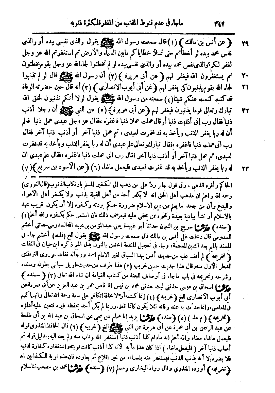 (عن أنس بن مالك) (1) قال سمعت رسول الله صلى الله عليه وسلم يقول والذي نفسي بيده أو والذي نفس محمد بيده لو أخطأتم حتى تملأ خطاياكم ما بين السماء والأرض ثم استغفرتم الله عز وجل لغفر لكم والذي نفس محمد بيده أو والذي نفسي بيده لو لم تخطئوا لجاء الله عز وجل بقوم يخطئون ثم يستغفرون الله فيغفر لهم (عن أبي هريرة) (2) أن رسول الله صلى الله عليه وسلم قال لو لم تذنبوا لجاء الله بقوم يذنبون كي يغفر لهم (عن أبي أيوب الانصاري) (3) انه قال حين حضرته الوفاة قد كنت كتمت عنكم شيئا (4) سمعته من رسول الله صلى الله عليه وسلم يقول لولا أنكم تذنبون لخلق الله تبارك وتعالى قوما يذنبون فيغفر لهم (عن ابي هريرة) (5) عن النبي صلى الله عليه وسلم ان رجلا أذنب ذنبا فقال رب اني اذنبت ذنبا أو قال عملت عملا ذنبا فاغفره فقال عز وجل عبدي عمل ذنبا فعلم أن له ربا يغفر الذنب ويأخذ به قد غفرت لعبدي ثم عمل ذنبا آخر أو أذنب ذنبا آخر فقال رب اني عملت ذنبا فاغفره فقال تبارك وتعالى علم عبدي ان له ربا يغفر الذنب ويأخذ به قد غفرت لعبدي ثم عمل ذنبا آخر أو أذنب ذنبا آخر فقال رب اني عملت ذنبا فاغفره فقال علم عبدي ان له رب يغفر الذنب ويأخذ به قد غفرت لعبدي فليعمل ما شاء (6) (عن الأسود بن سريع) (7)