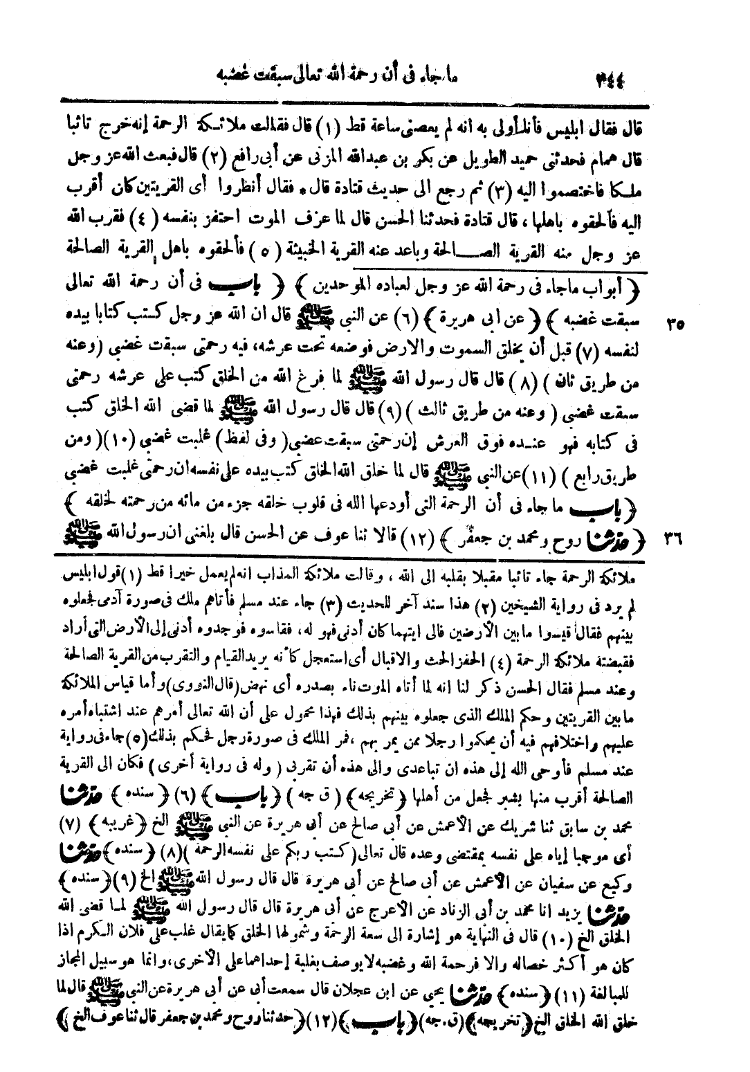 ملائكة الرحمة جاء تائبا مقبلا بقلبه إلى الله وقالت ملائكة العذاب انه لم يعمل خيرا قط (1) قول ابليس لم يرد في رواية الشيخين (2) هذا سند آخر للحديث (3) جاء عند مسلم فأتاهم ملك في صورة آدمي فجعلوه بينهم فقال قيسوا ما بين الأرضين فالى ايتهما كان ادنى فهو له فقاسوا فوجدوه ادنى إلى الأرض التي اراد فقبضته ملائكة الرحمة (4) الحفز الحث والاقبال أي استعجل كأنه يريد القيام والتقرب من القرية الصالحة وعند مسلم فقال الحسن ذكر لنا انه لما اتاه الموت ناء بصدره أي نهض (قال النووي) وأما قياس الملائكة ما بين القريتين وحكم الملك الذي جعلوه بينهم بذلك فهو محمول على أن الله تعالى أمرهم عند اشتباه امره عليهم واختلافهم فيه ان يحكموا رجلا ممن يمر بهم فمر الملك في صورة رجل فحكم بذلك (5) جاء في رواية عند مسلم فأوحى الله إلى هذه ان تباعدي والى هذه أن تقربي (وله في رواية أخرى) فكان الى القرية الصالحة أقرب منها بشبر فجعل من أهلها (تخريجه) (ق جه) (باب) (6) (سنده) حدثنا محمد بن سابق ثنا شريك عن الأعمش عن أبي صالح عن أبي هريرة عن النبي صلى الله عليه وسلم الخ (غريبه) (7) أي موجبا إياه على نفسه بمقتضى وعده قال تعالى (كتب ربكم على نفسه الرحمة) (8) (سنده) حدثنا وكيع عن سفيان عن الأعمش عن أبي صالح عن أبي هريرة قال قال رسول الله صلى الله عليه وسلم الخ (9) (سنده) حدثنا يزيد انا محمد بن أبي الزناد عن الأعرج عن أبي هريرة قال قال رسول الله صلى الله عليه وسلم لما قضى الله الخلق الخ (10) قال في النهاية هو اشارة إلى سعة الرحمة وشمولها الخلق كما يقال غلب على فلان الكرم اذا كان هو أكثر خصاله وإلا فرحمة الله وغضبه لا يوصف بغلبة إحداهما على الأخرى وانما هو سبيل المجاز للمبالغة (11) (سنده) حدثنا يحيى عن ابن عجلان قال سمعت أبي عن ابي هريرة عن النبي صلى الله عليه وسلم قال لما خلق الله الخلق الخ (تخريجه) (ق جه) (باب) (12) (حدثنا روح ومحمد بن جعفر قال ثنا عوف الخ)
